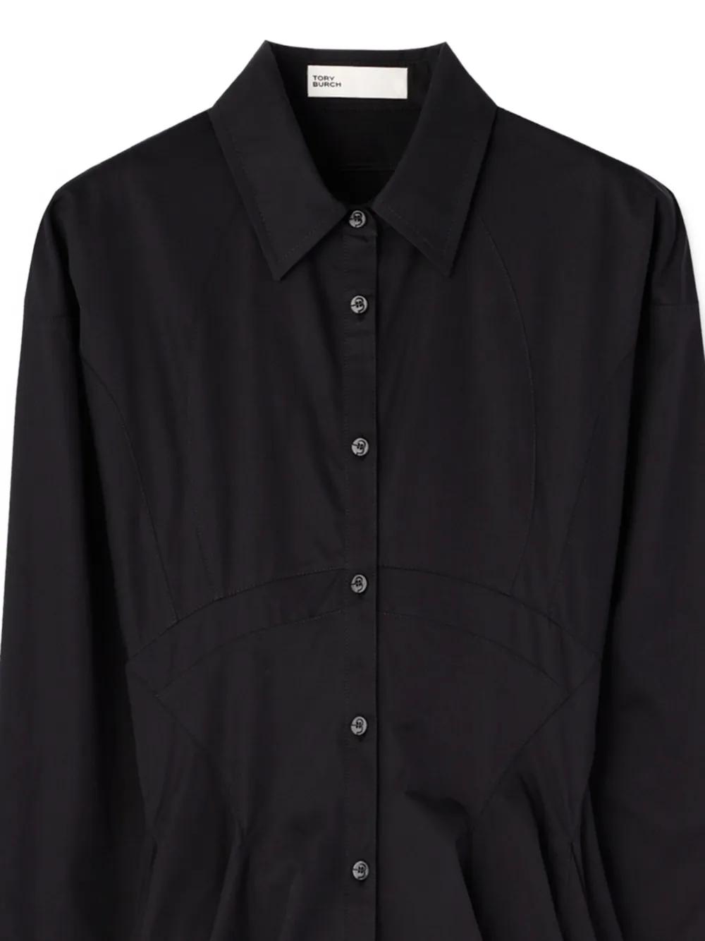 black button-up front long sleeves belted waist curved hemline cuffed sleeves