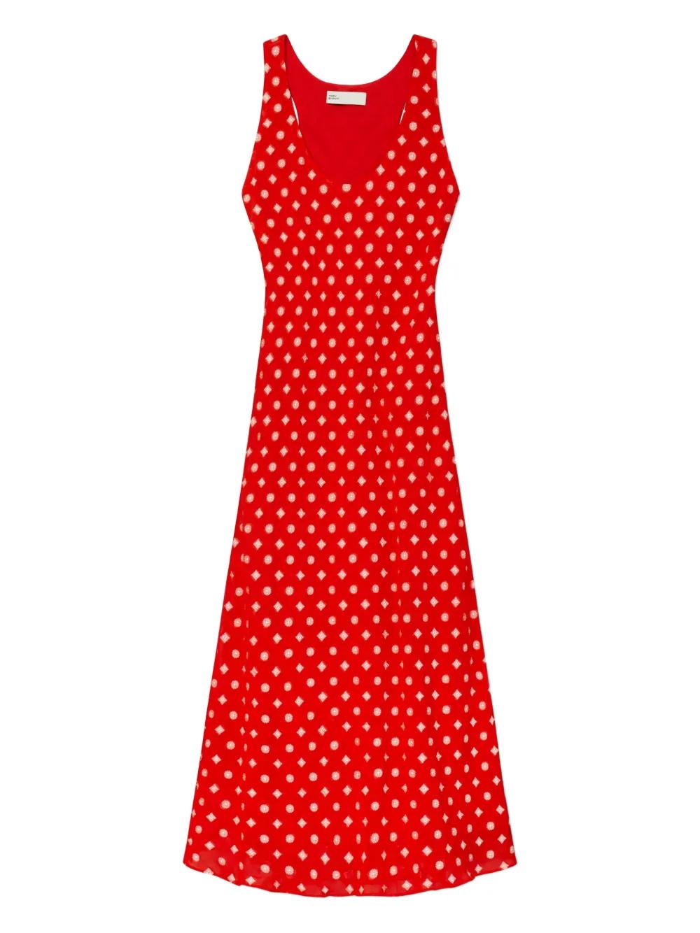 red scoop neck sleeveless fitted bodice flared hem patterned jacquard