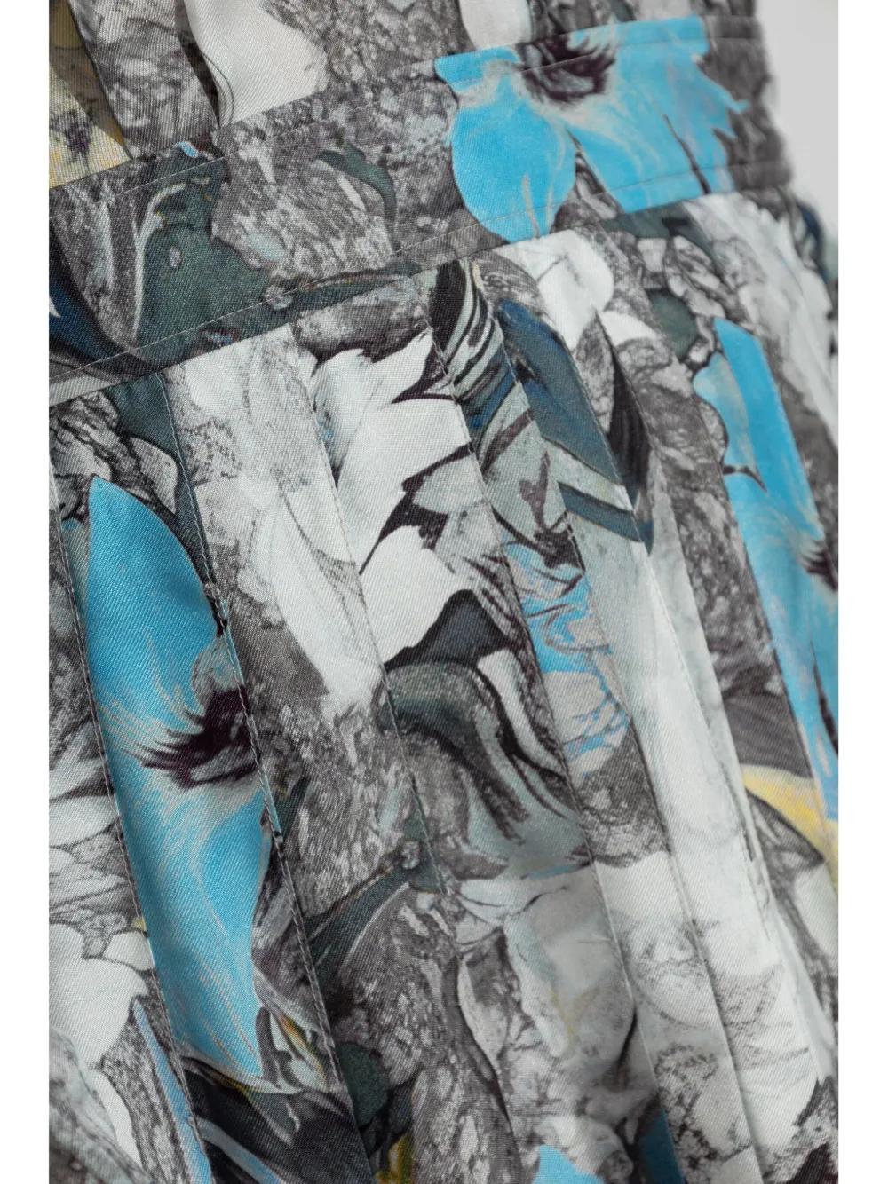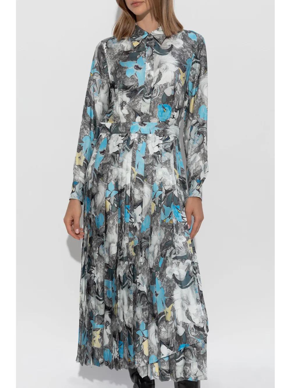 light grey/light blue/white silk all-over floral print pleated skirt front button placket straight-point collar long sleeves belted waist mid-length