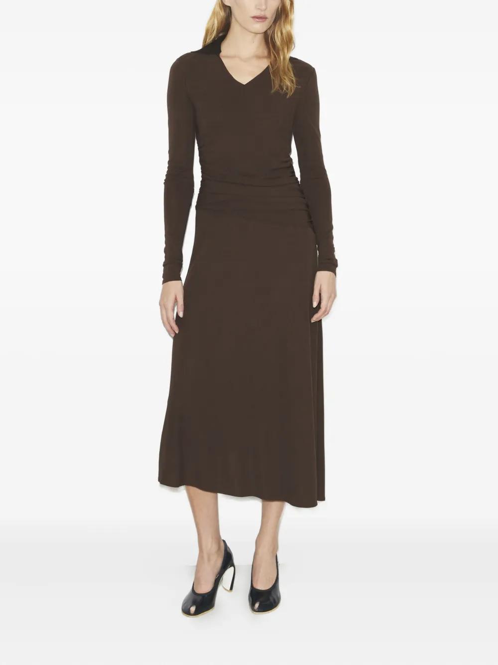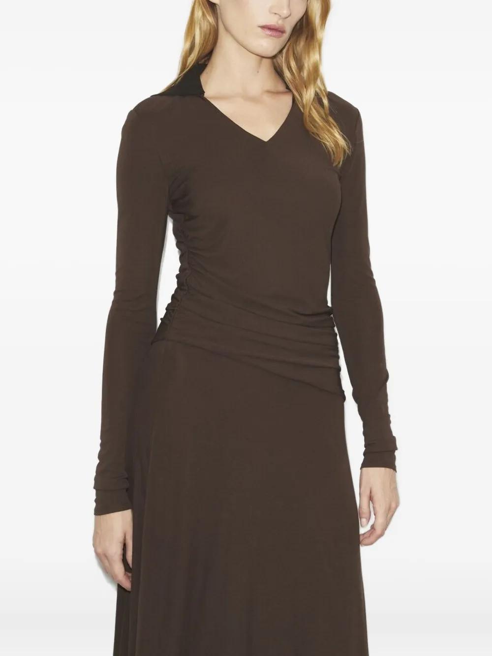 brown v-neck long sleeves ruched detailing asymmetric hem