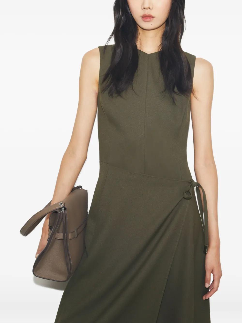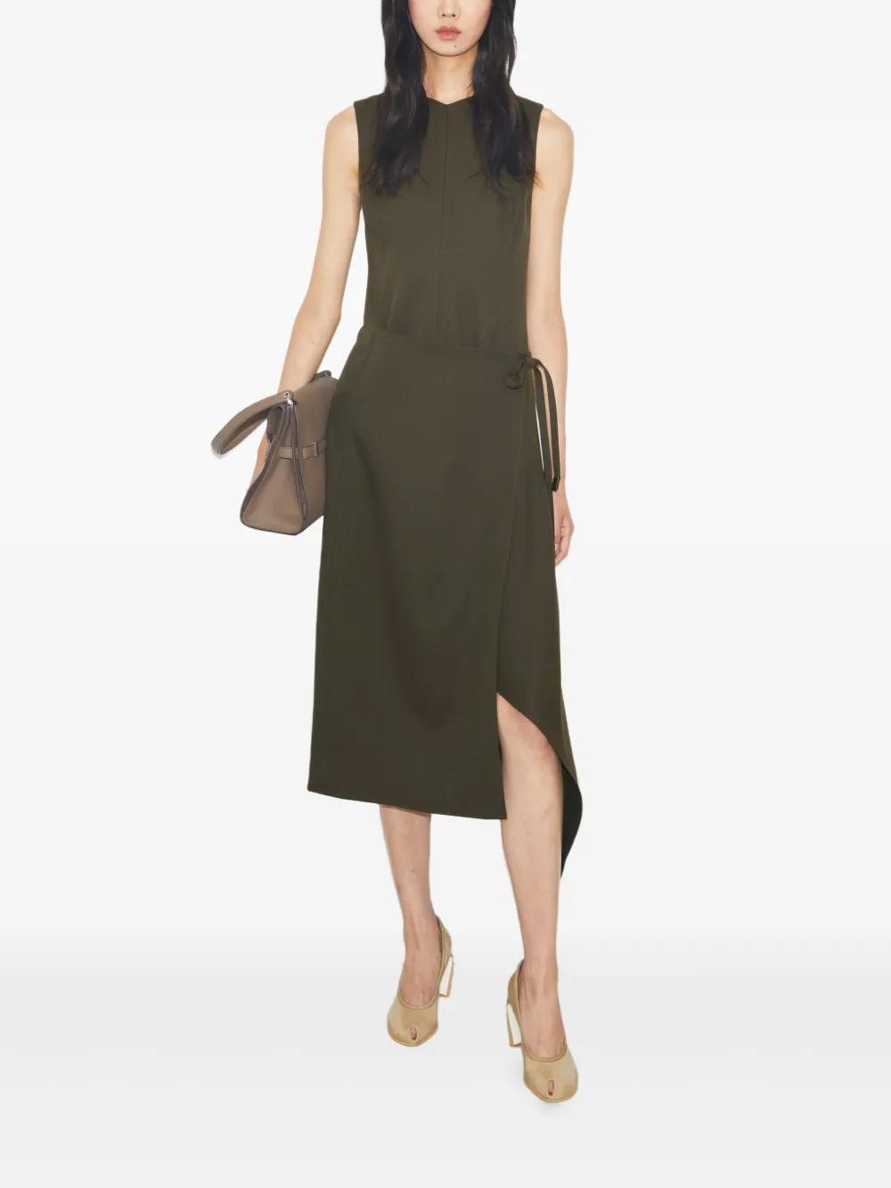 olive green asymmetrical hem sleeveless faux-wrap skirt tie fastening