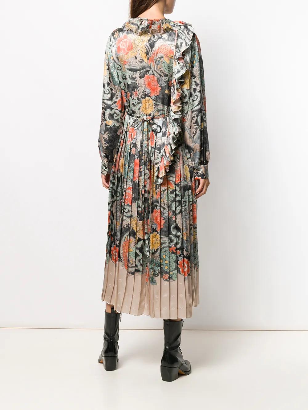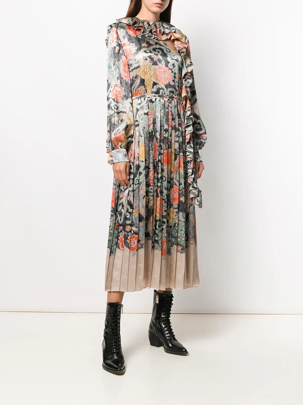 Capture the essence of Italian luxury and glamour with the latest Valentino collection, as showcased with this multicoloured stretch silk oriental print water satin dress. Featuring a ruffled neck, long sleeves, a ruffle trimming, a fitted waist, a pleated skirt, a rear zip fastening and a long length.