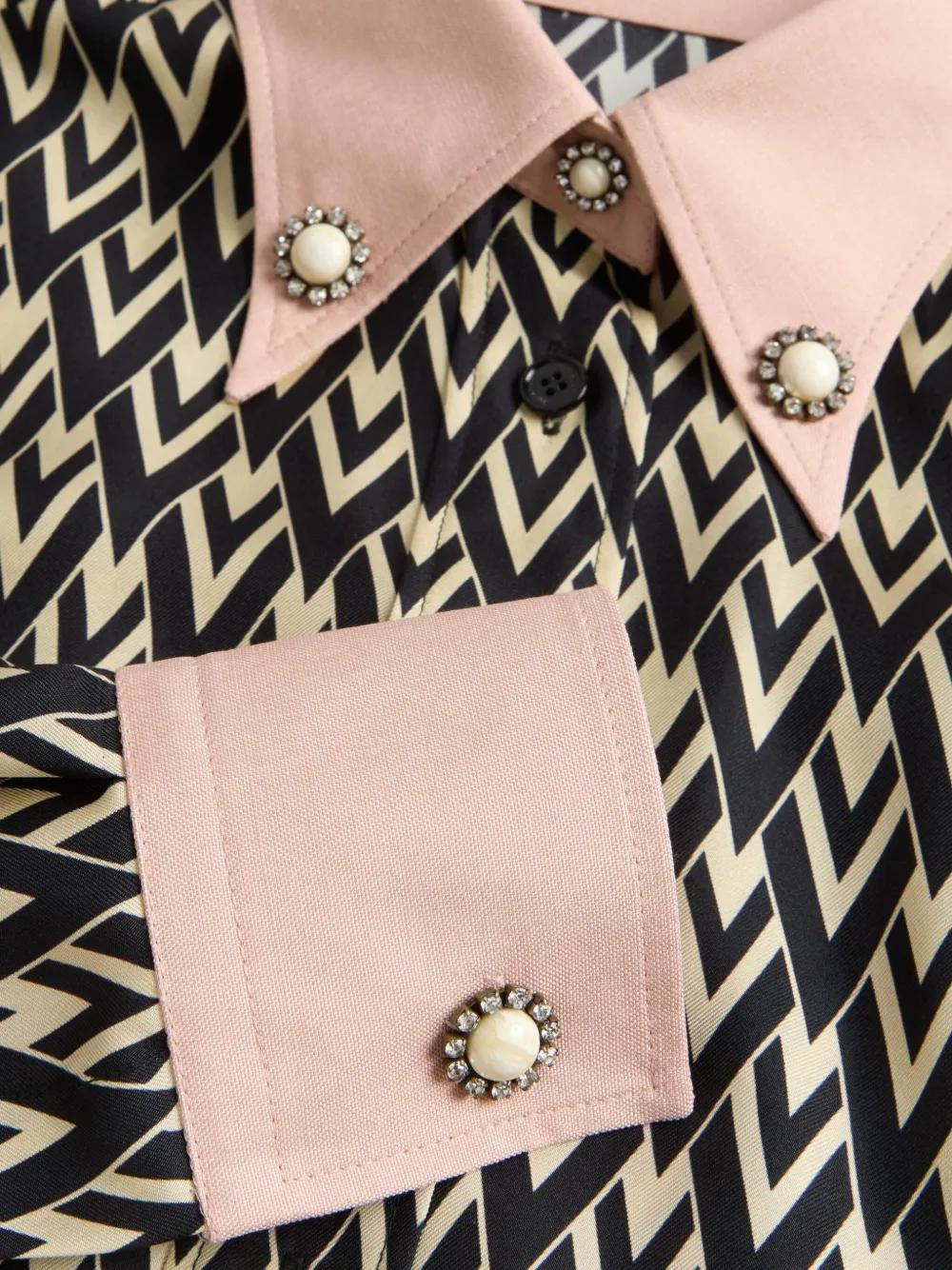 black/white silk geometric-pattern print button fastening long sleeves tied waist