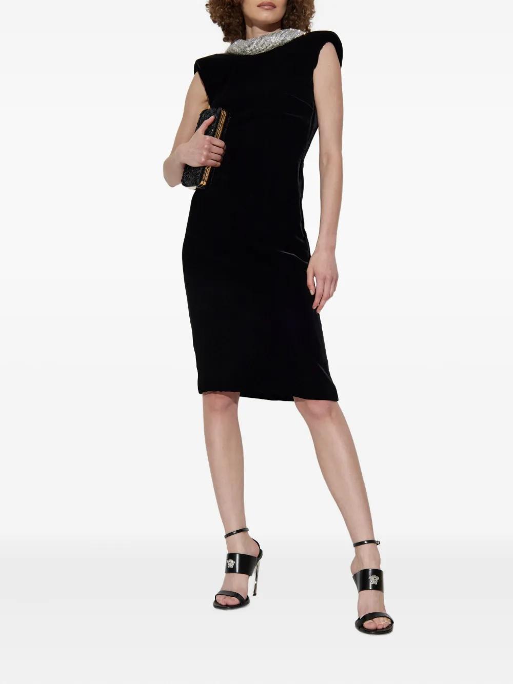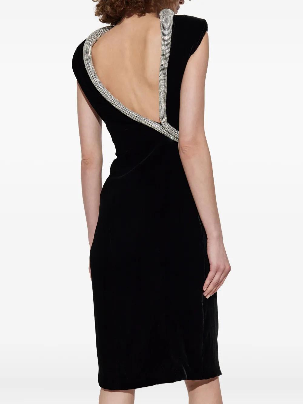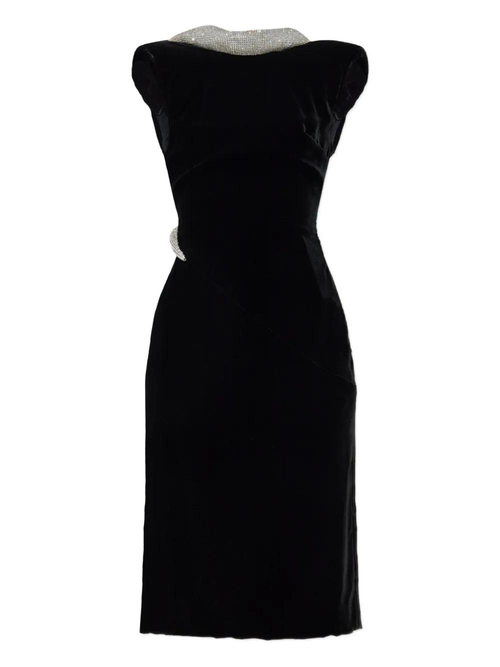 black velvet material crystal embellishment sleeveless open back fitted bodice