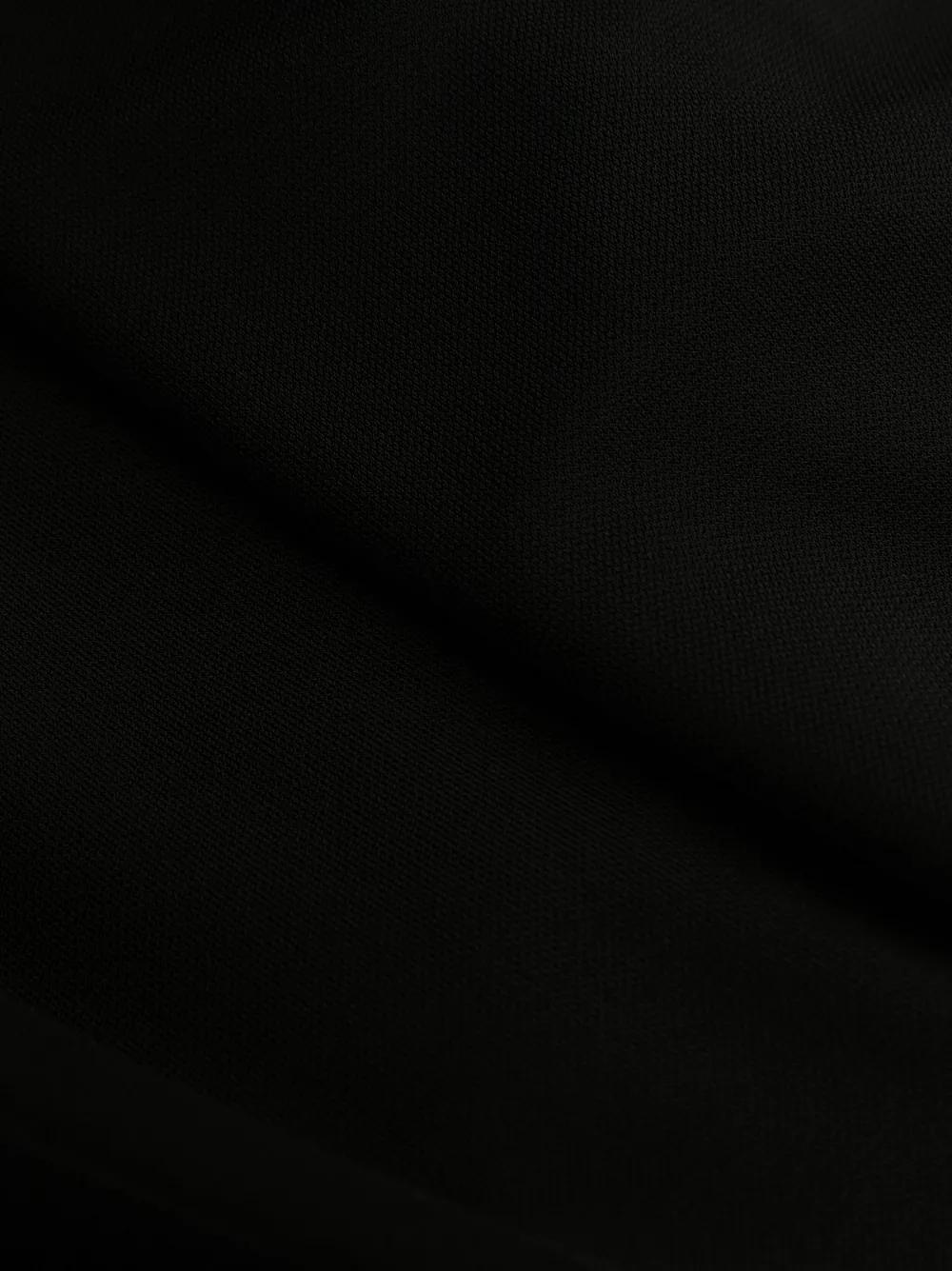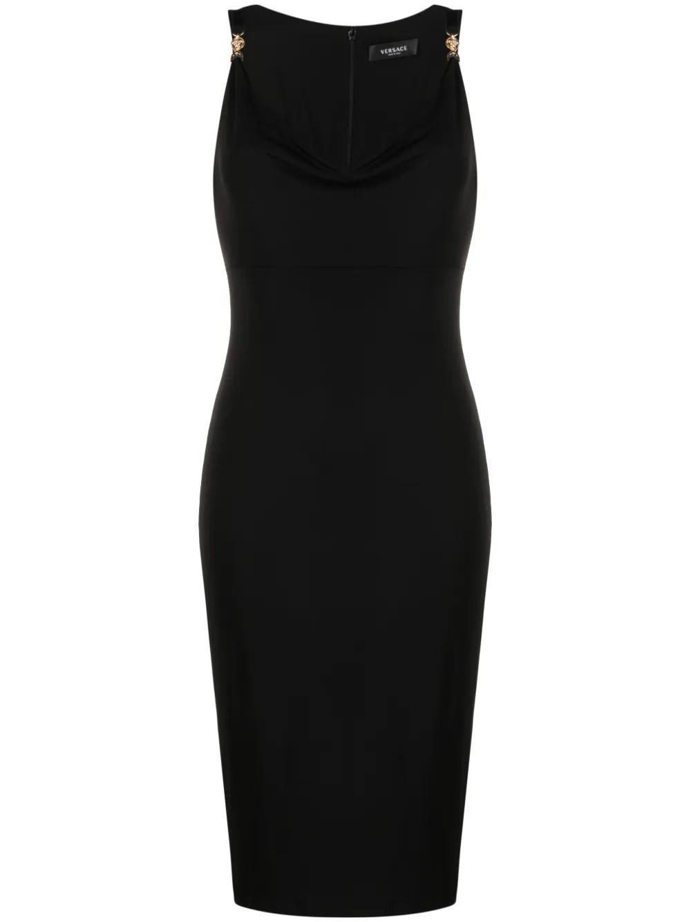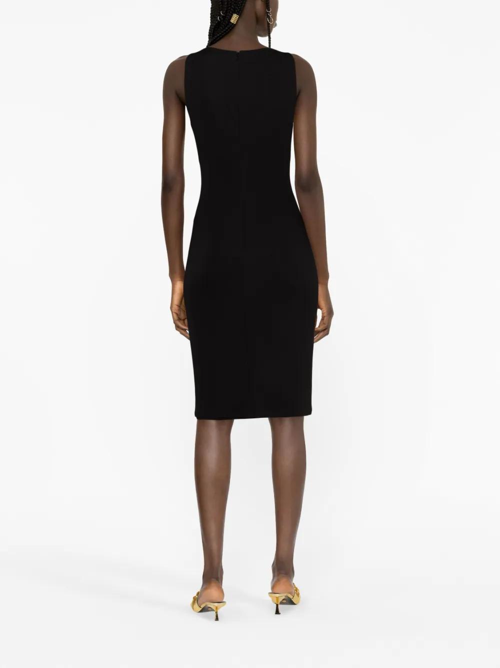 jet black stretch-design Medusa Head motif scoop neck sleeveless fitted waistline rear zip fastening straight hem knee-length