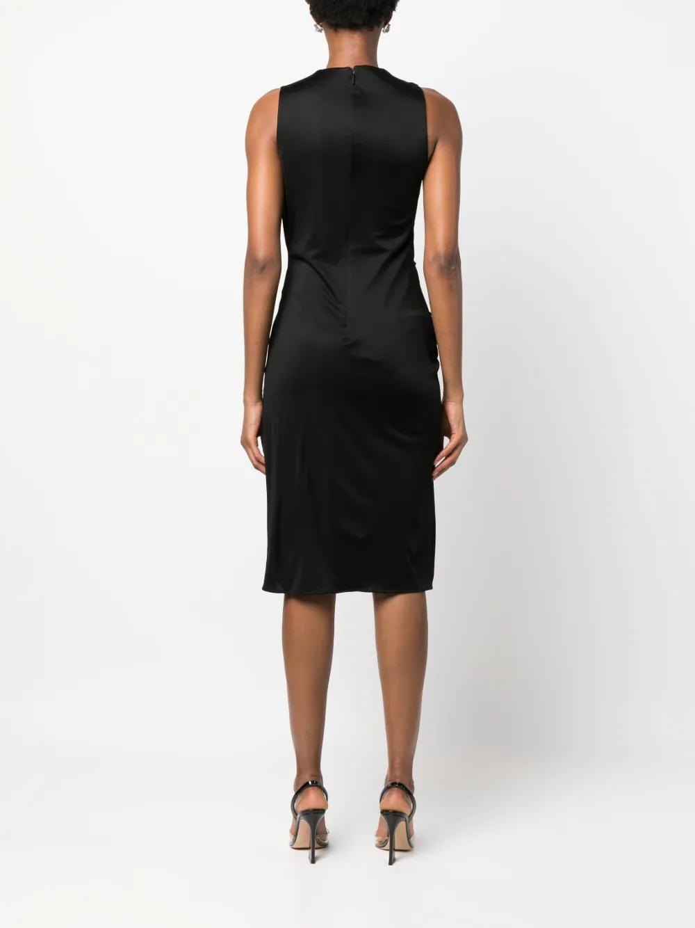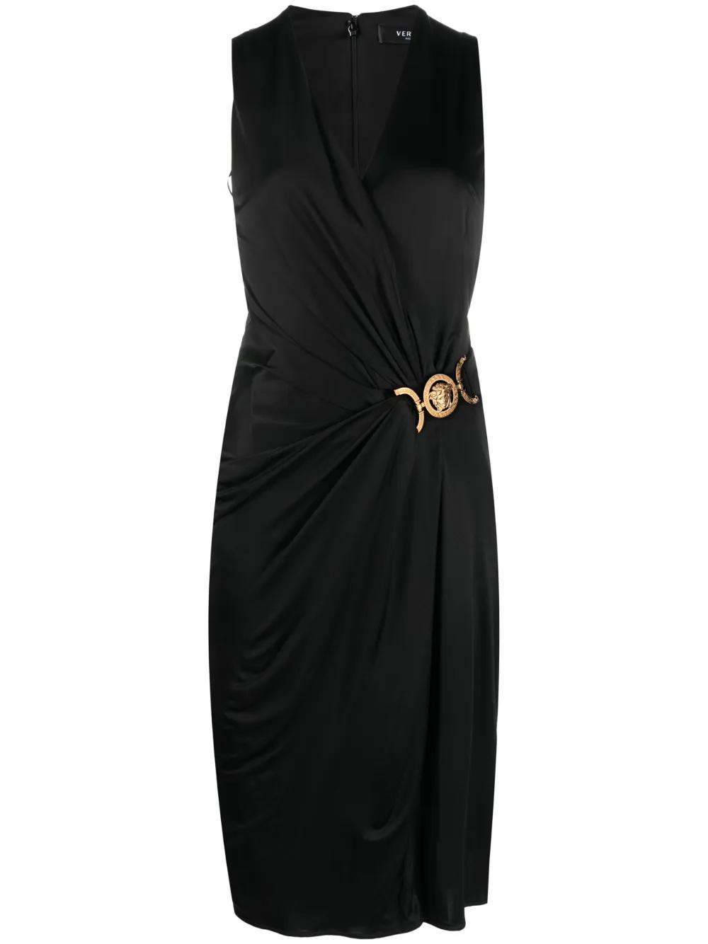 black stretch-design Medusa plaque detail gathered detailing pleat detailing V-neck sleeveless knee-length straight hem