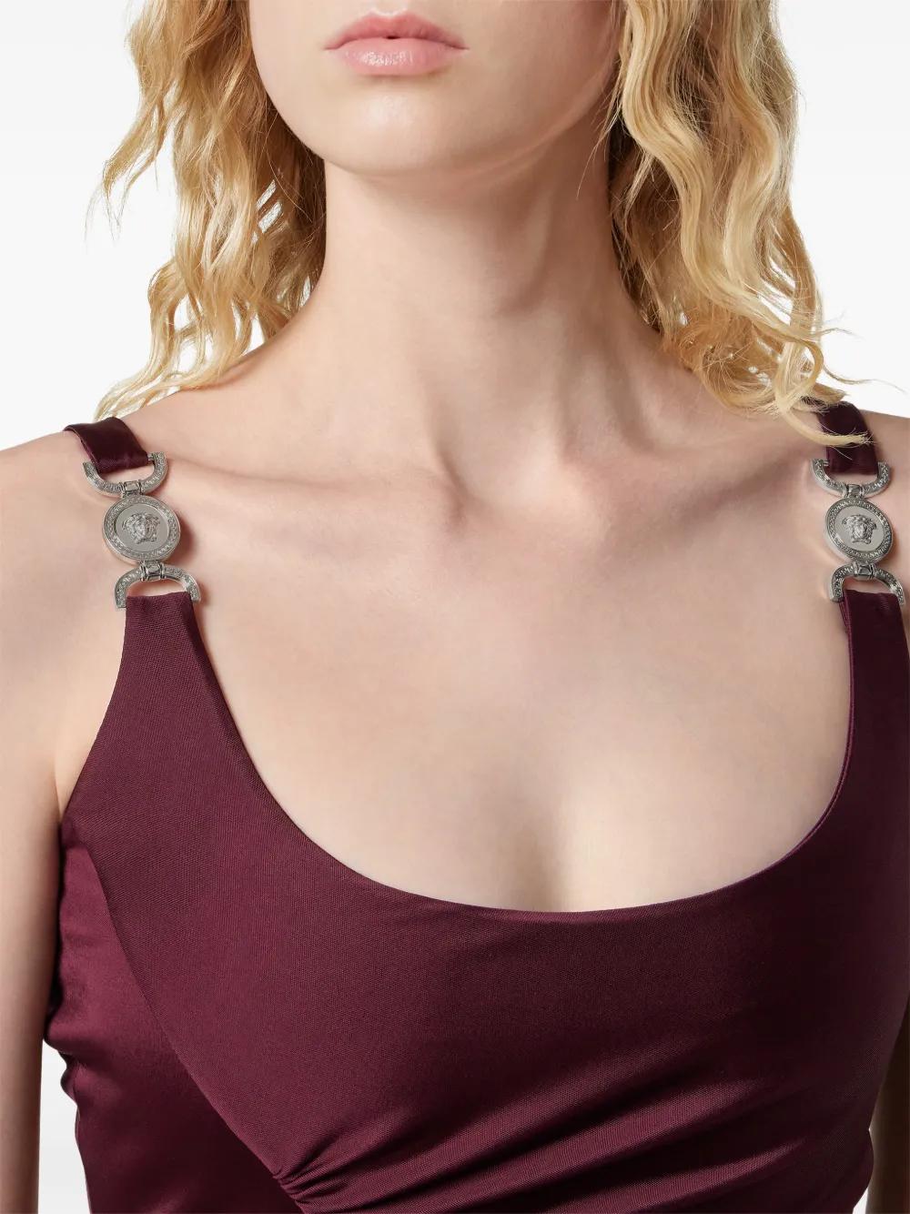dark red ruched detailing hardware detailing sleeveless scoop neck midi length