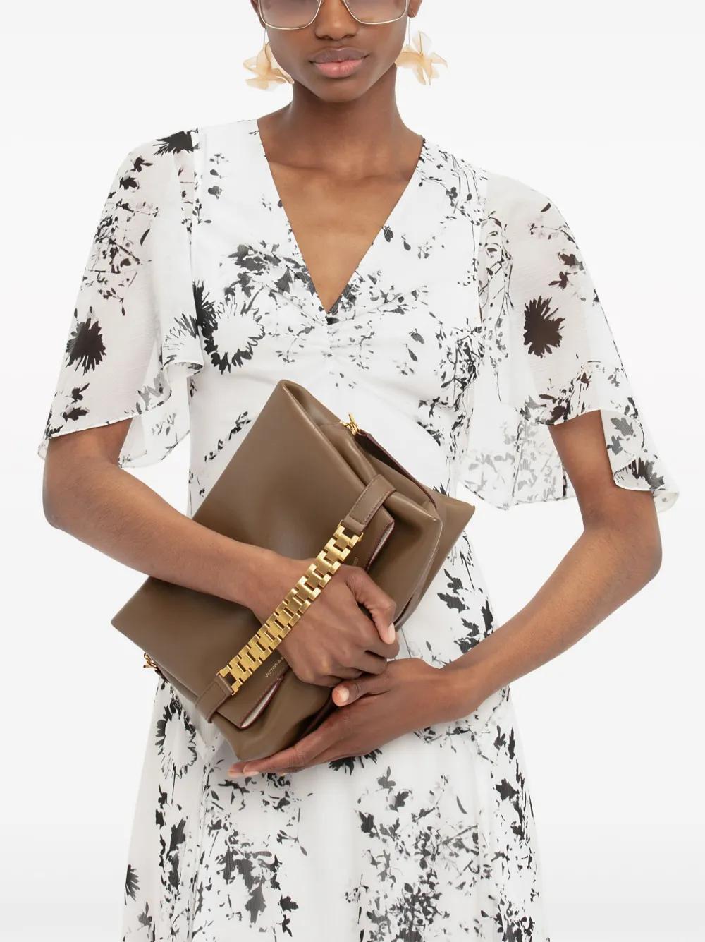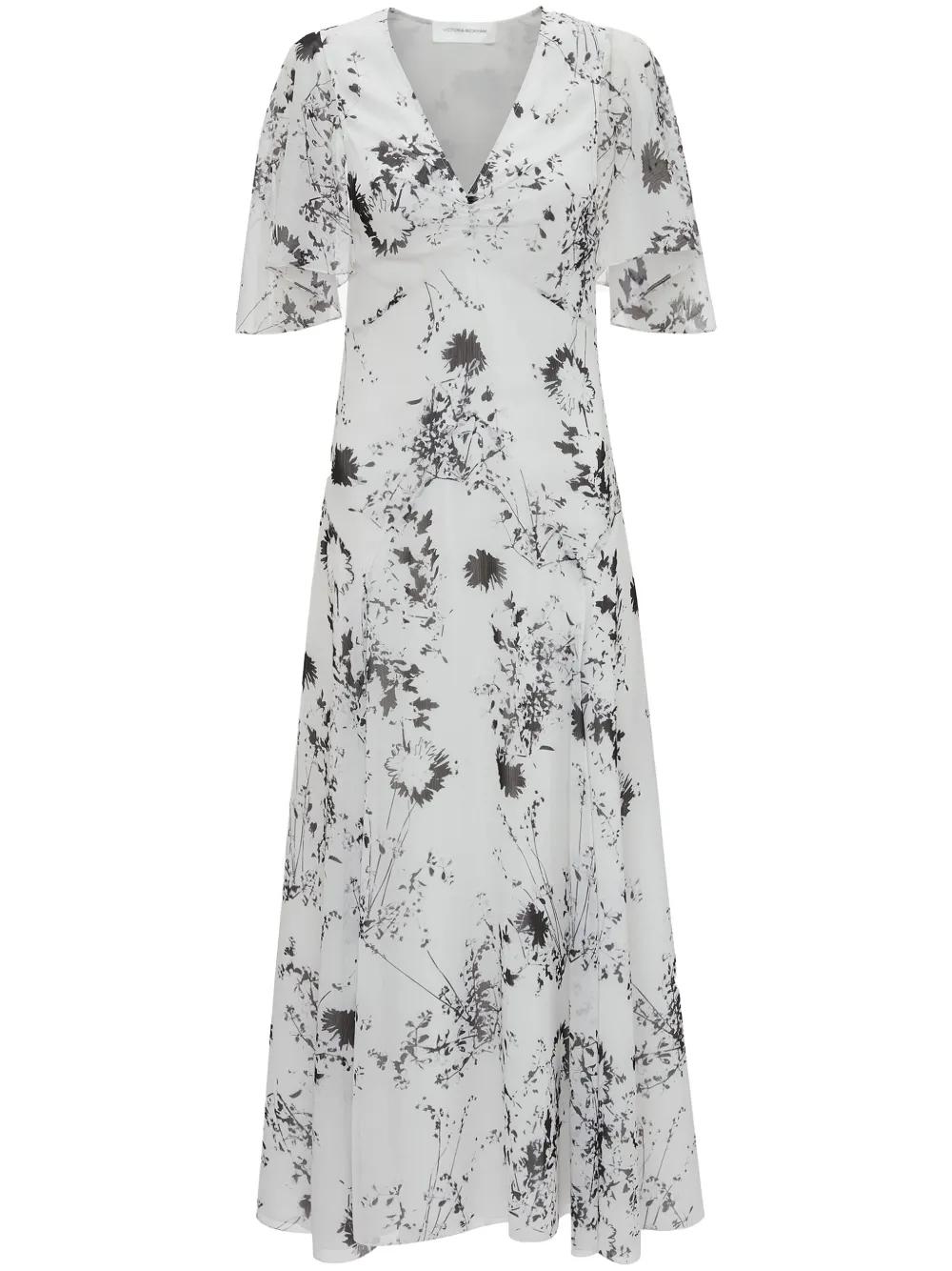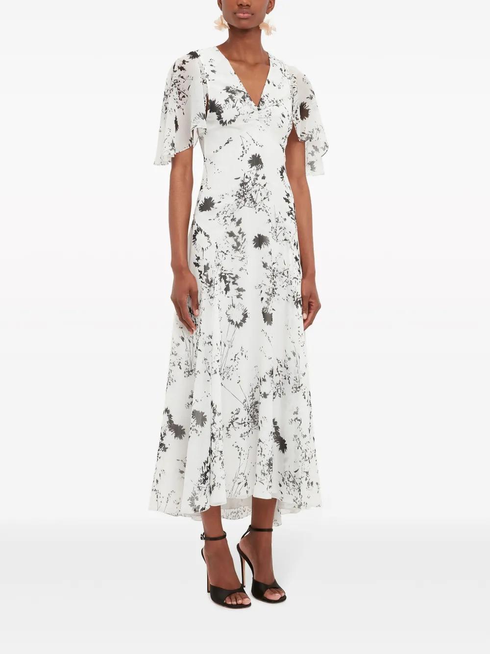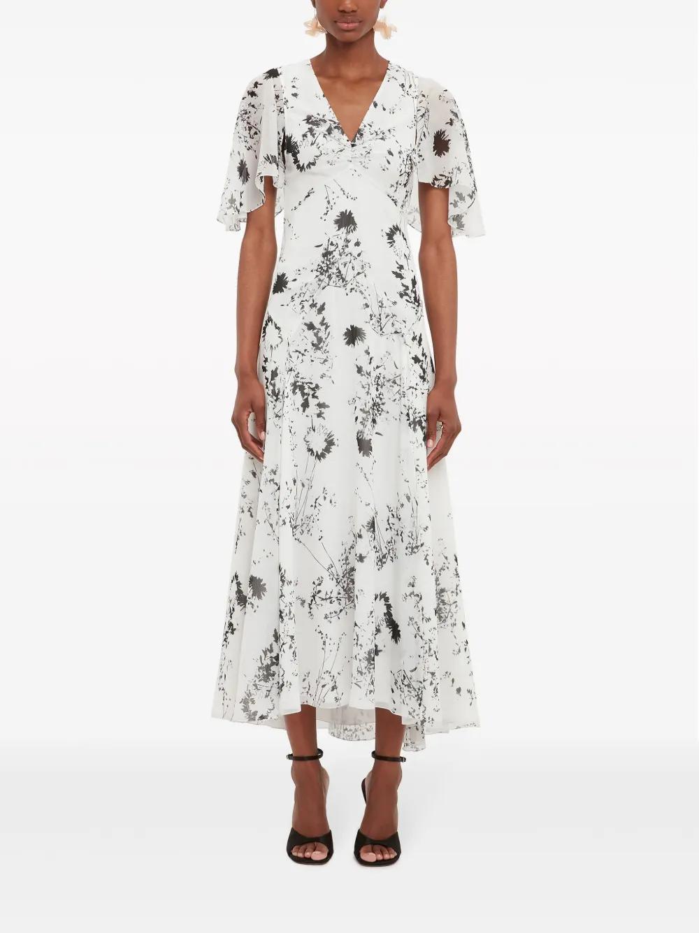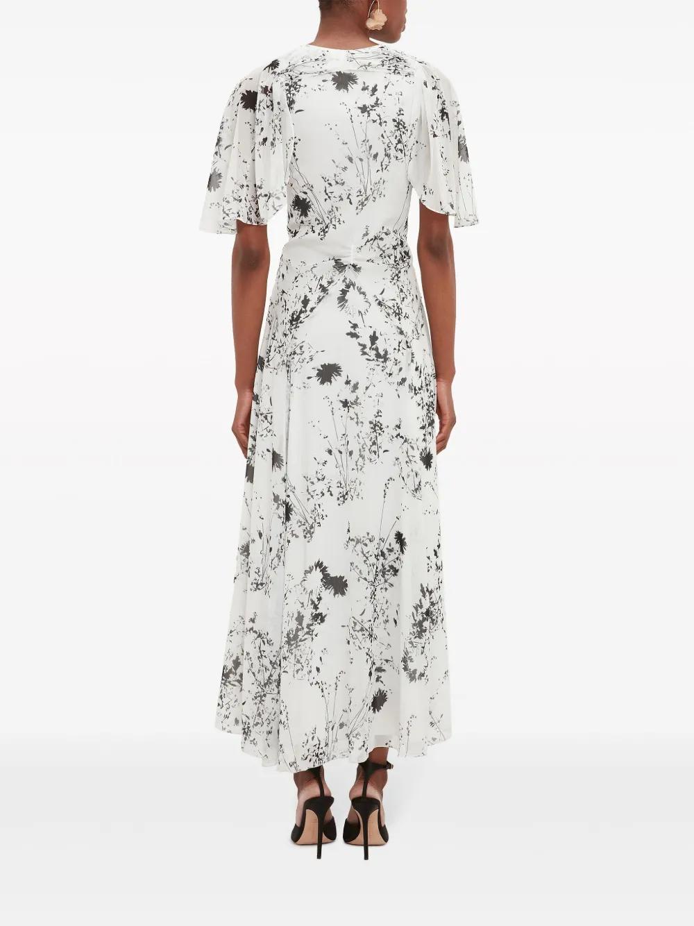 off-white/dark grey plissé effect all-over floral print gathered detailing V-neck short sleeves mid-length