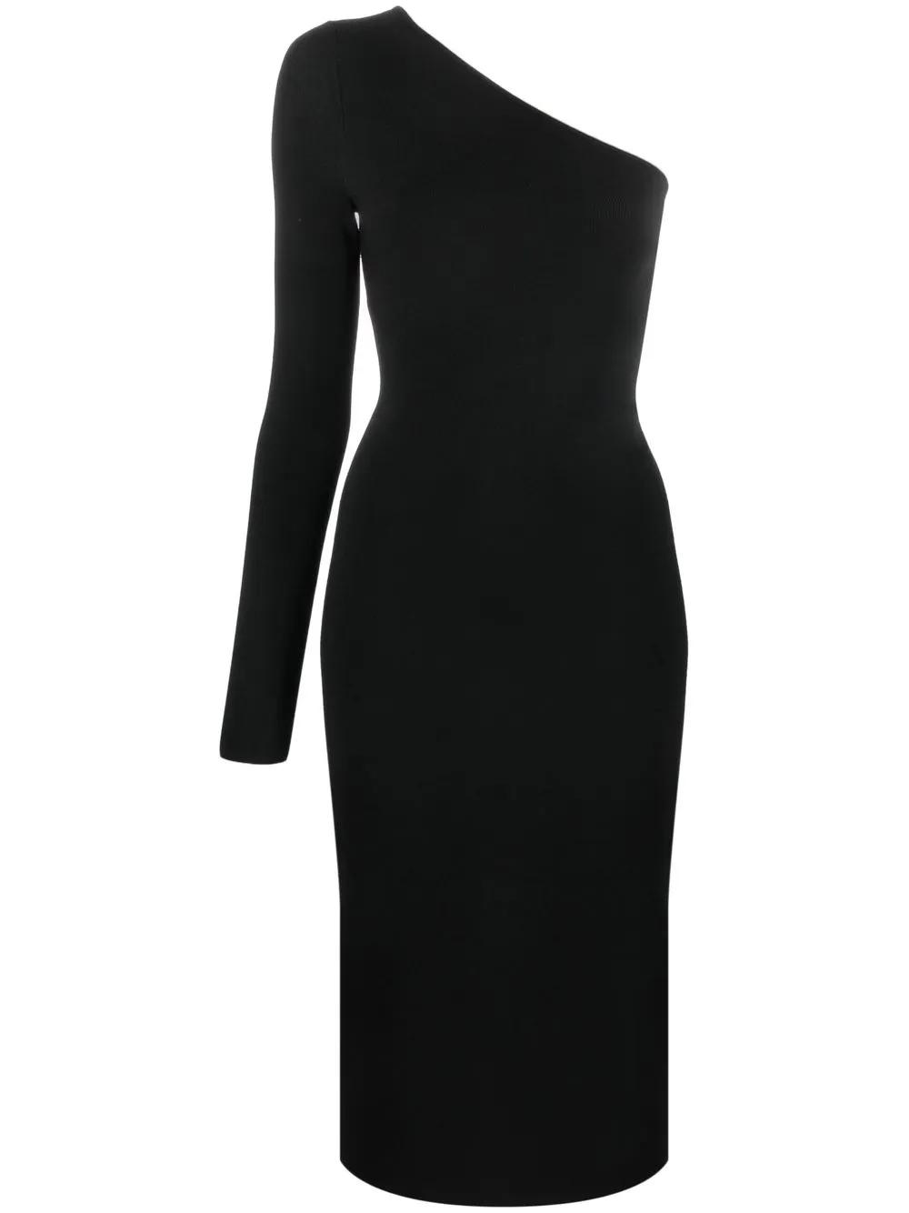 black one-shoulder ribbed knit central rear vent single-sleeve design mid-length
