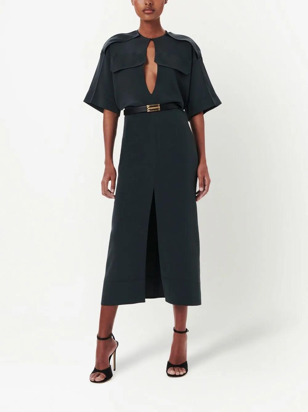 steel grey round neck keyhole neck short sleeves epaulettes concealed rear zip fastening front slit at hem