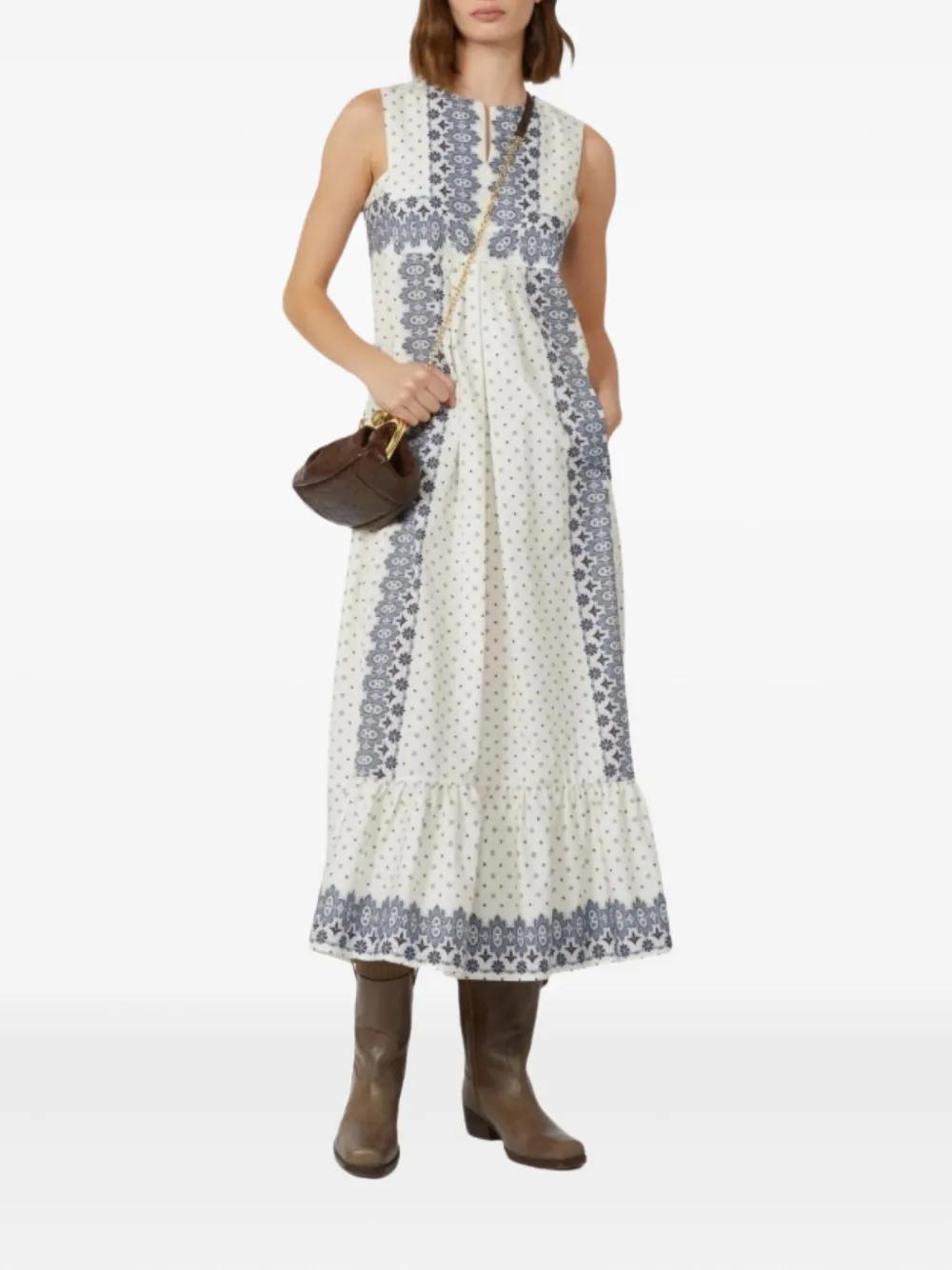 off-white paisley print sleeveless round neck tiered skirt front pockets