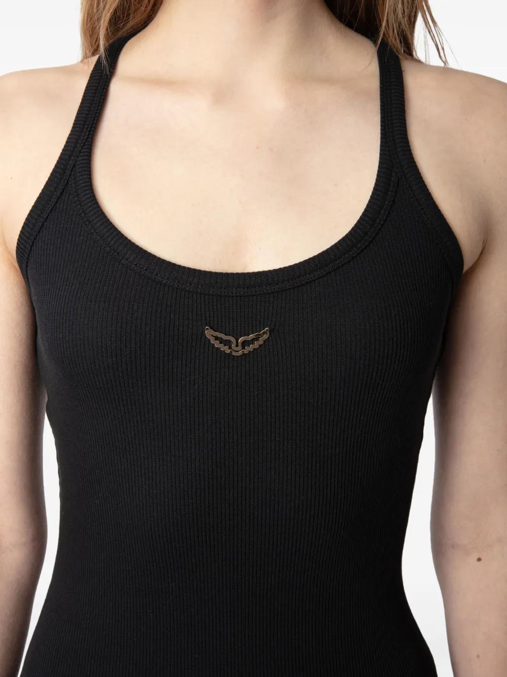 black short side slits scoop neck sleeveless gold-tone logo plaque