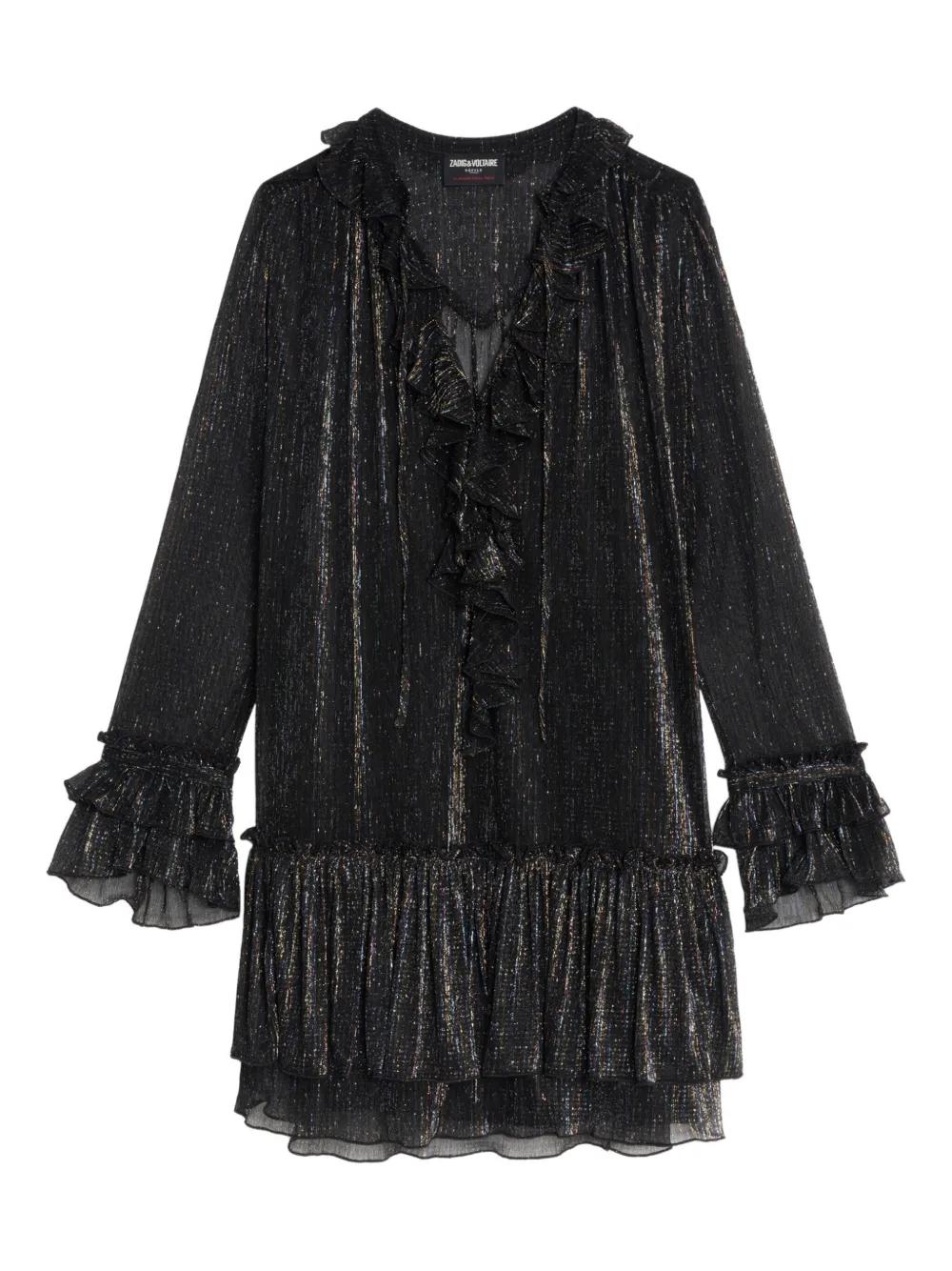 black ruffled v-neck long sleeves tiered hem shimmer detail ruffled cuffs