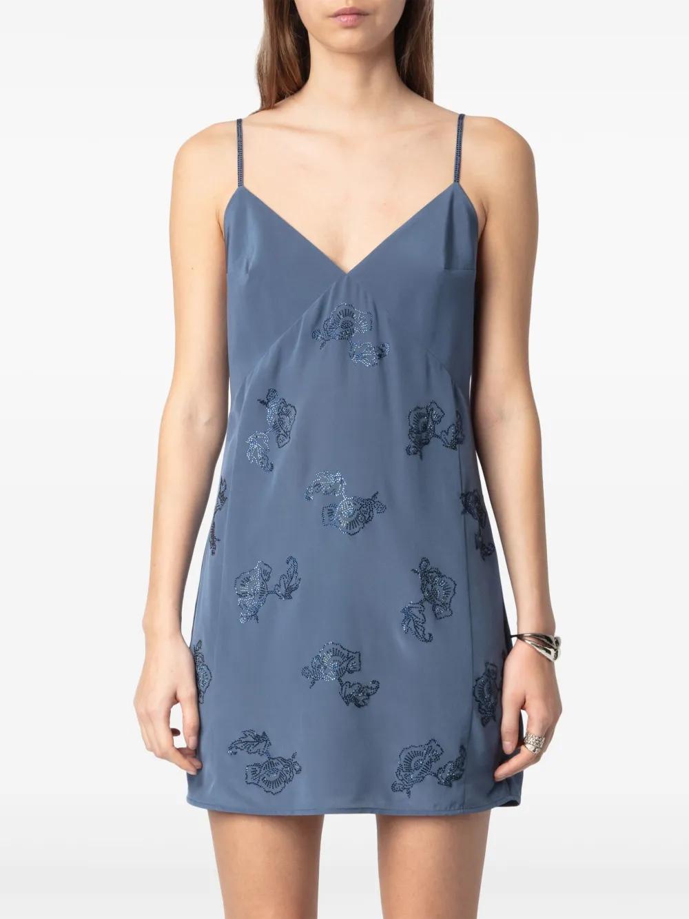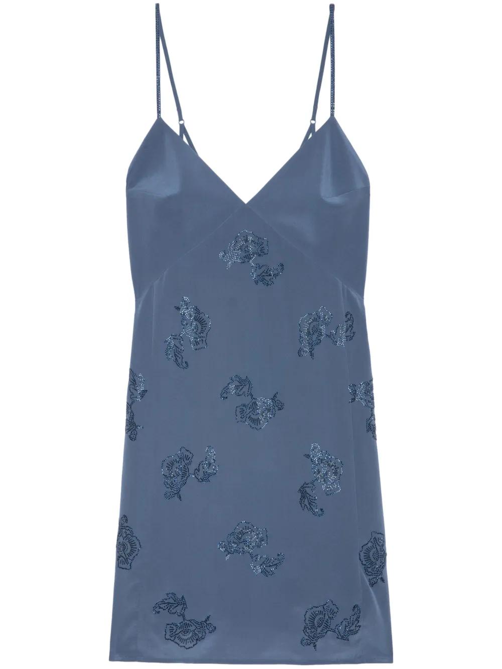 blue adjustable spaghetti straps V-neck rhinestone embellishment straight hem