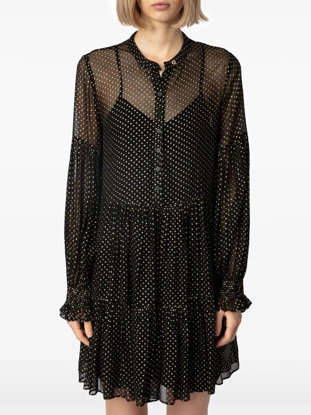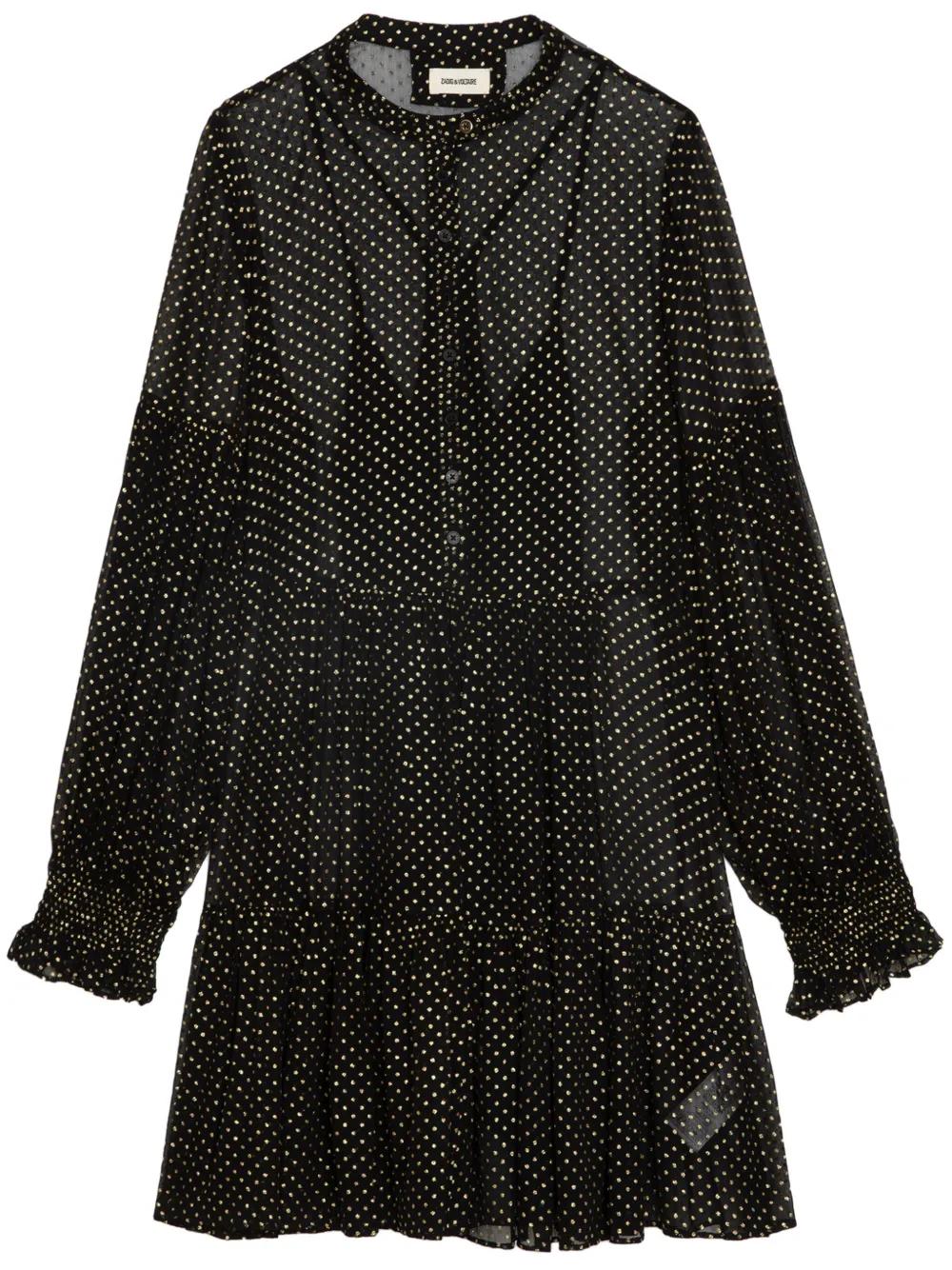 black sheer sequin design front button fastening round neck long sleeves ruffle hem detachable slip dress