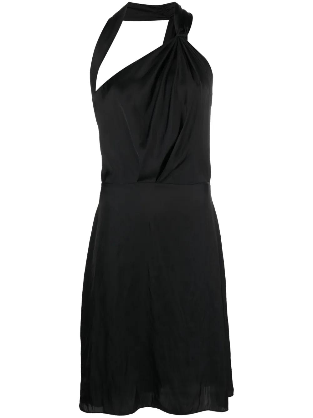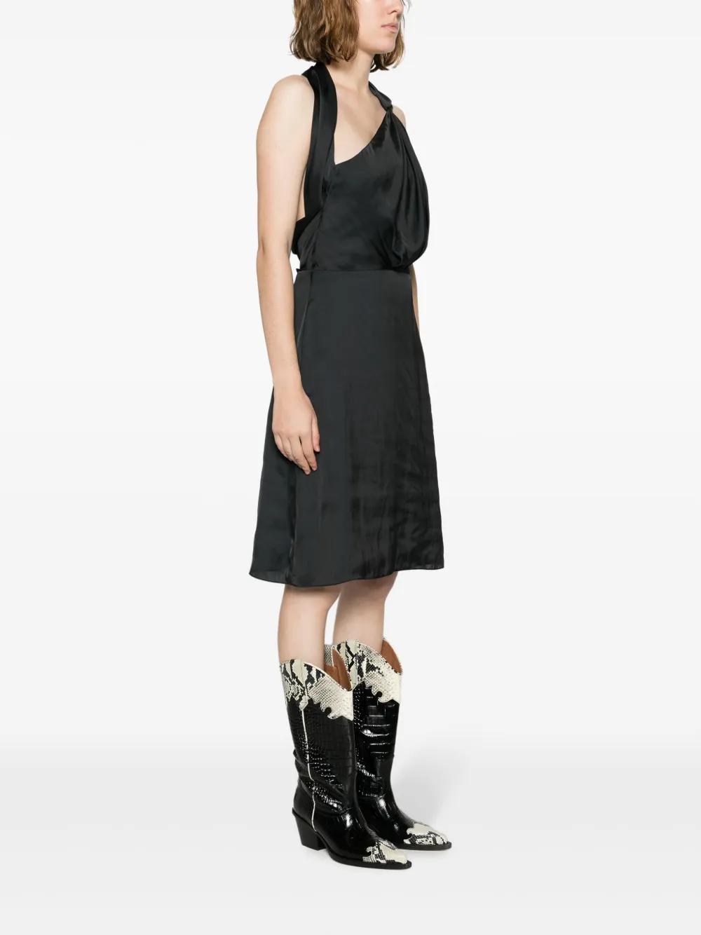olive black satin finish pleat detailing halterneck concealed side zip fastening sleeveless fitted waistline V-back straight hem knee-length unlined