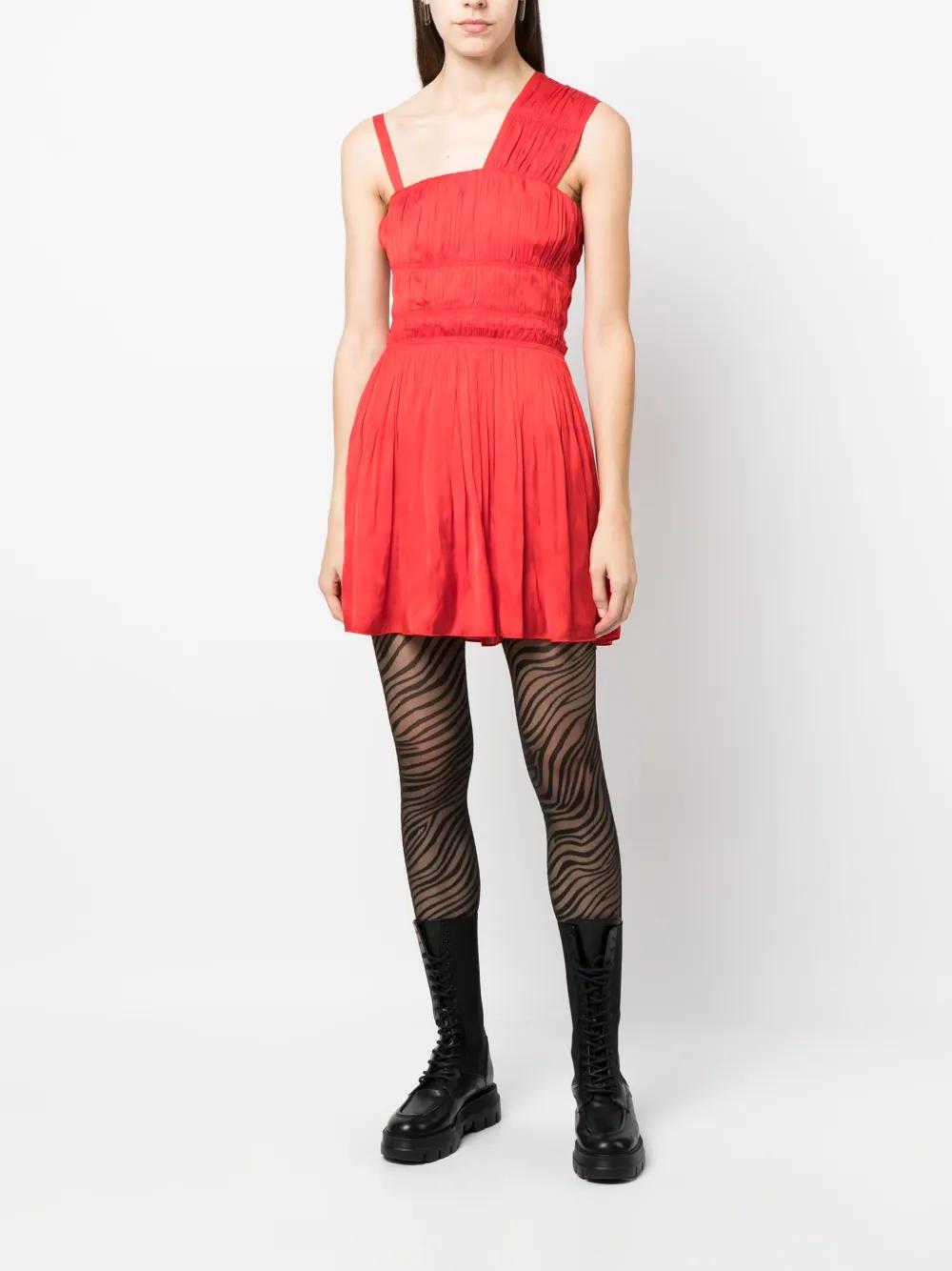 bright red satin finish fully pleated gathered detailing square neck asymmetric straps fitted waistline flared skirt thigh-length
