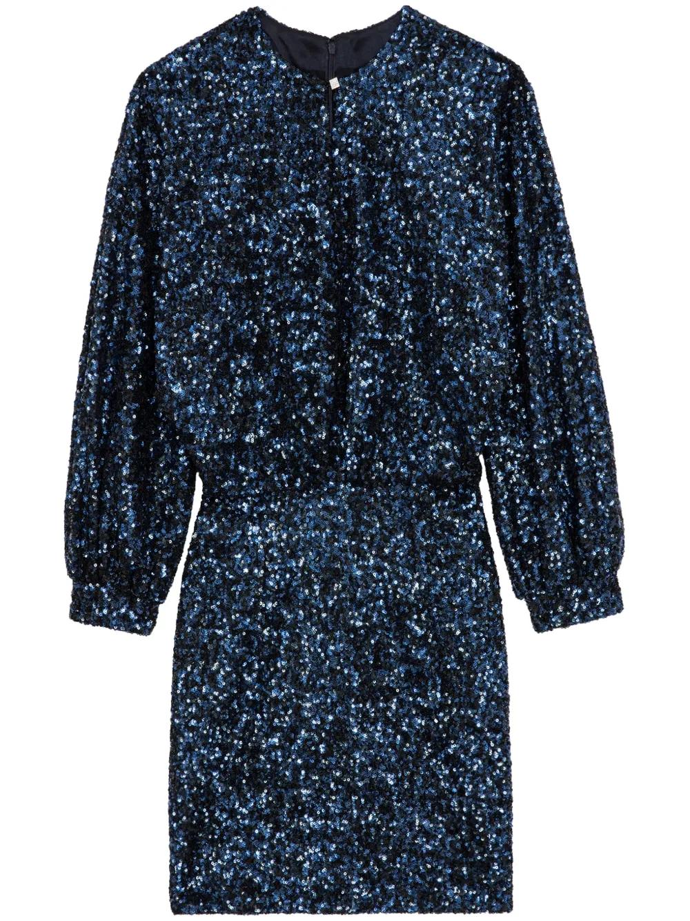 midnight blue sequin embellishment long puff sleeves concealed rear zip fastening fitted waistline