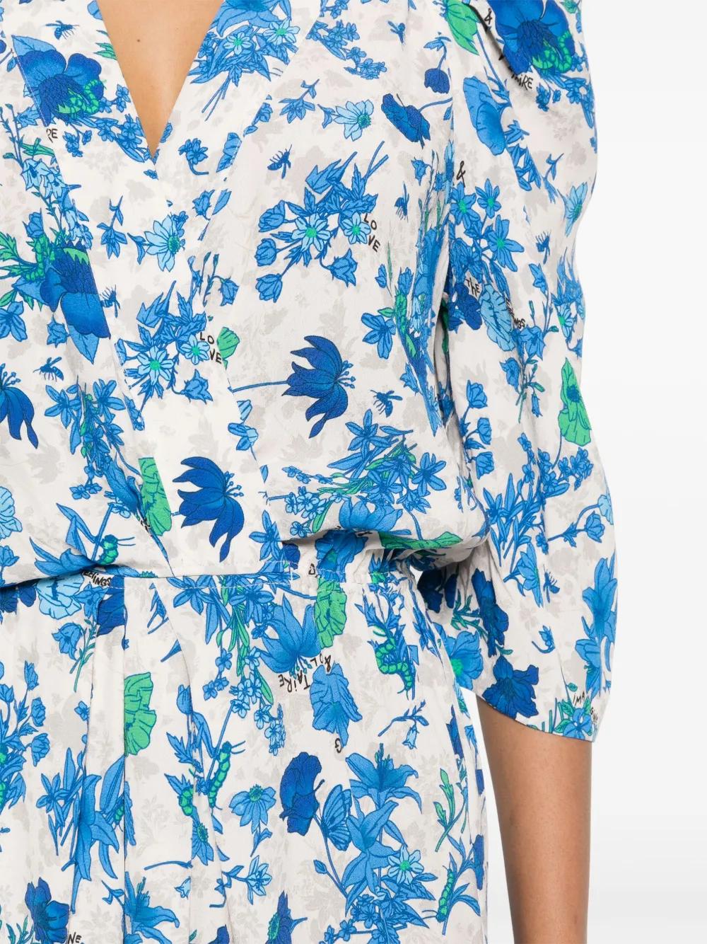 cerulean blue/ivory white/green crepe texture all-over garden flowers plunging V-neck pintuck detailing long sleeves elasticated waistband pleat detailing curved hem