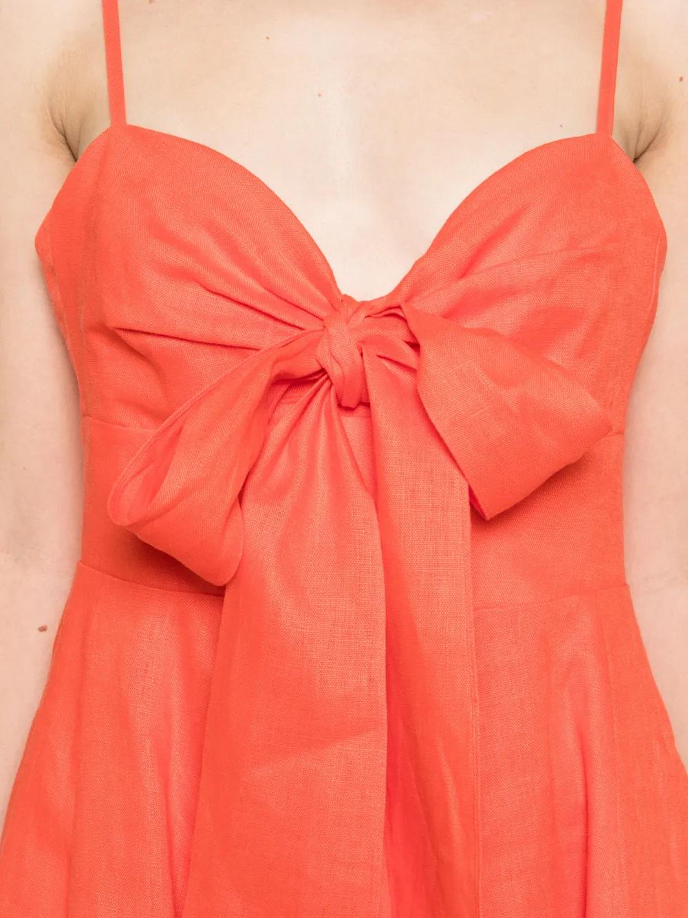 lava orange linen/flax concealed rear hook and zip fastening sweetheart neck adjustable spaghetti straps smocked panel bow detailing full lining flared skirt mid-length