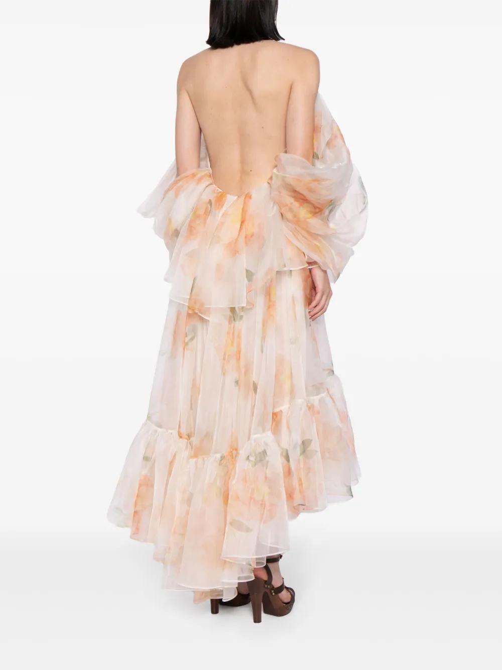 ivory white/multicolour silk organza flared all-over Camelia print ruched detailing halterneck tie fastening concealed rear zip fastening off-shoulder low back high-low hem mid-length partial lining
