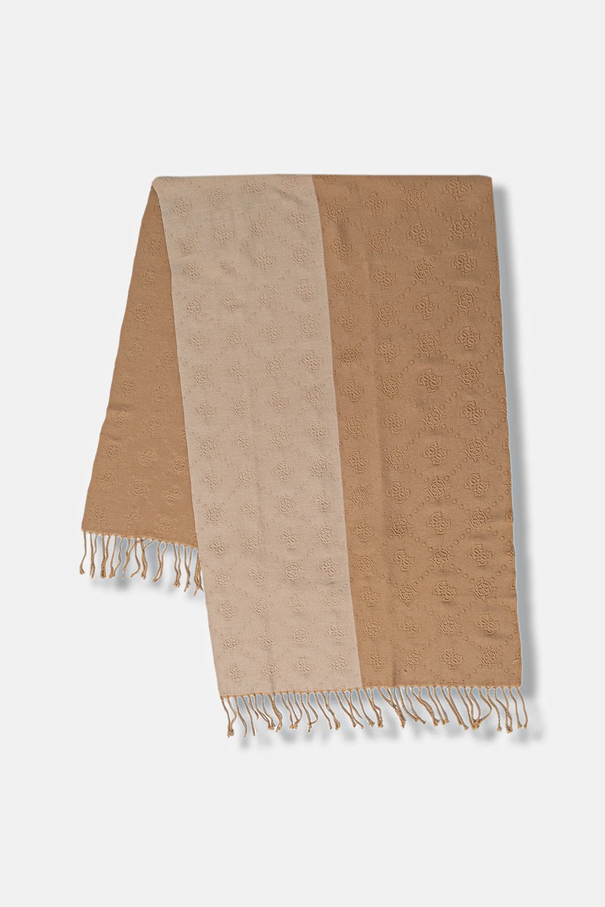 - Cienka, nieelastyczna tkanina. - Model z ozdobnymi frędzlami. - Wymiary: 70 cm x 180 cm.