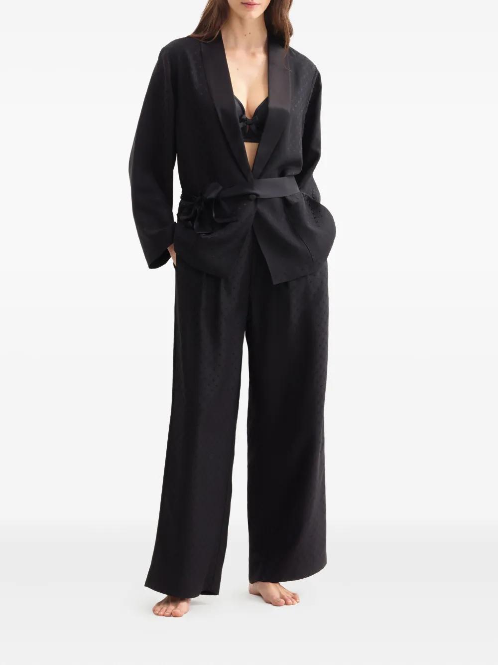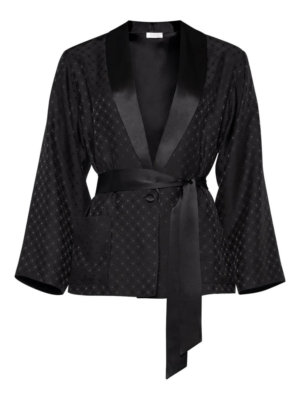 black satin trim geometric pattern single button fastening wide sleeves self-tie belt