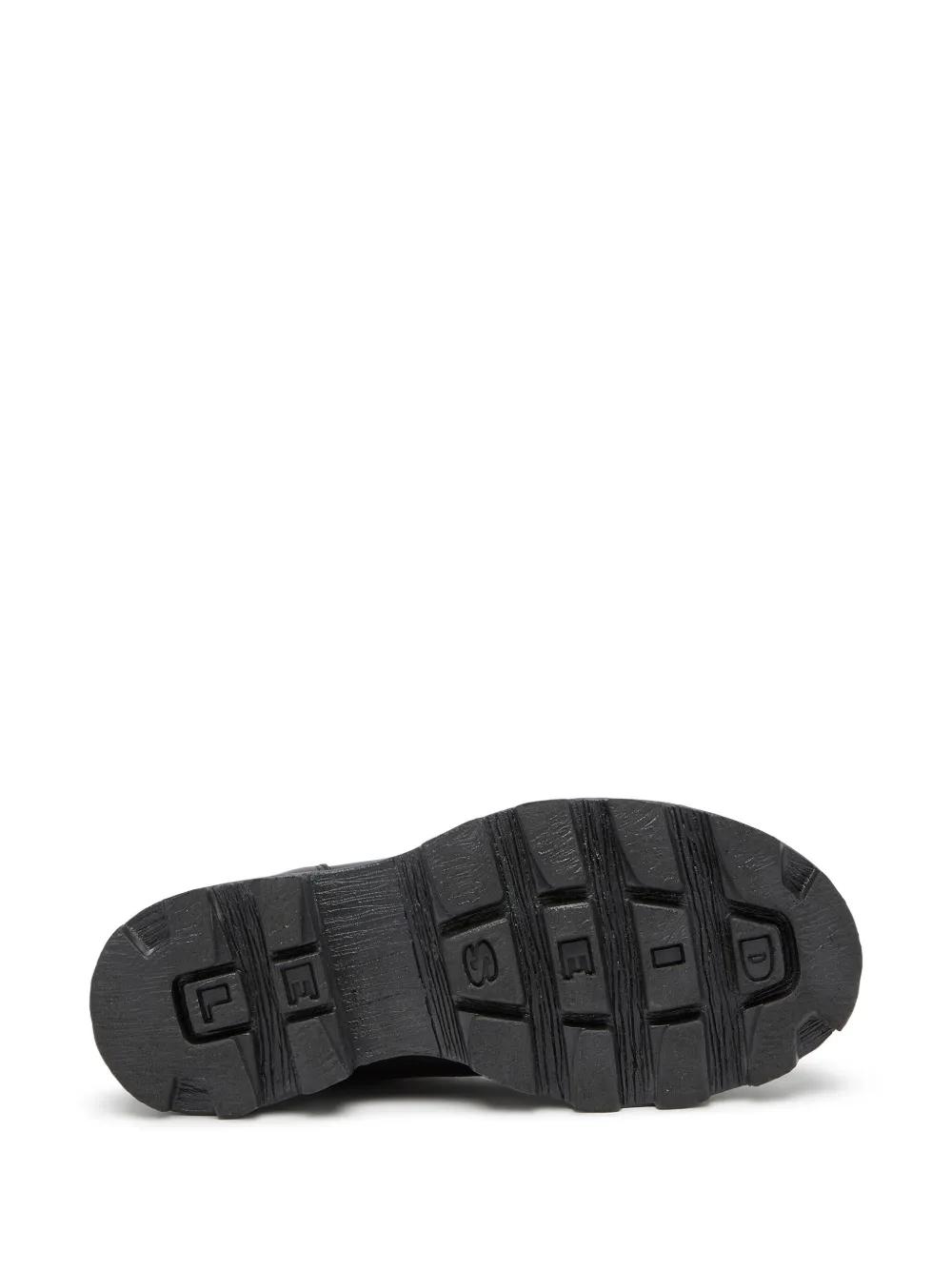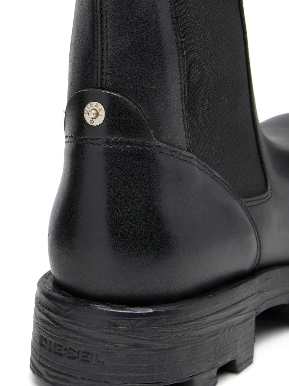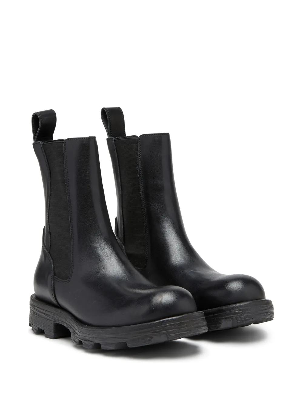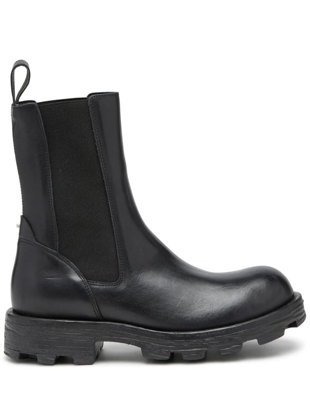 black calf leather smooth grain elasticated side panels pull-tab at the heel round toe ankle-length chunky rubber lug sole pull-on style