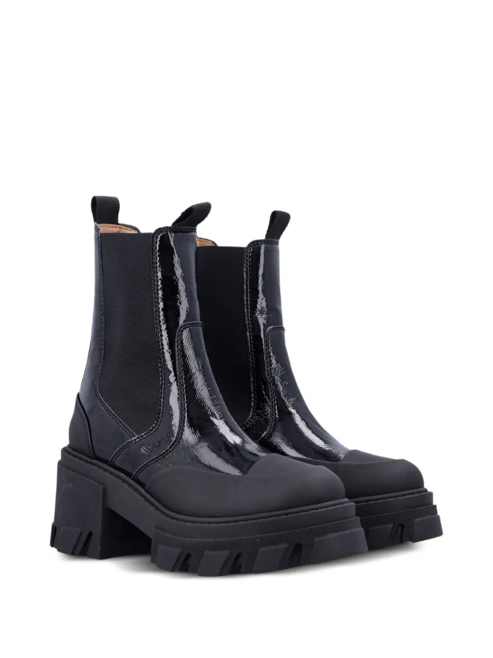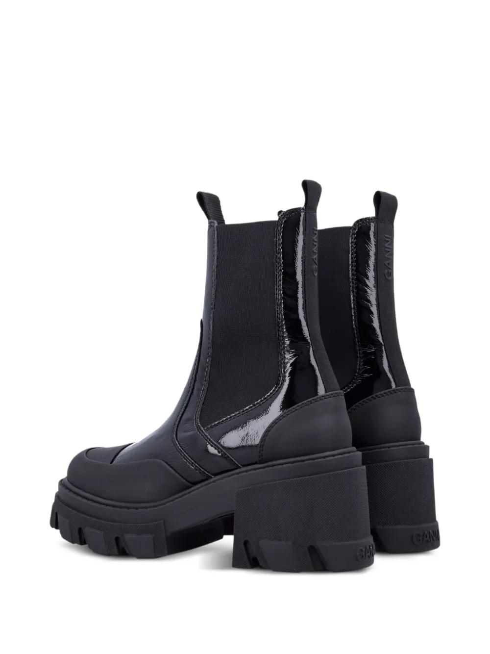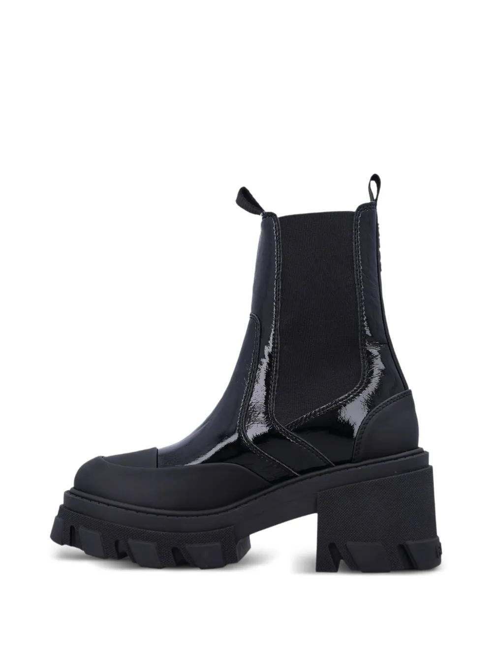 black patent leather cleated rubber sole block heel Chelsea-style elastic side panels round toe