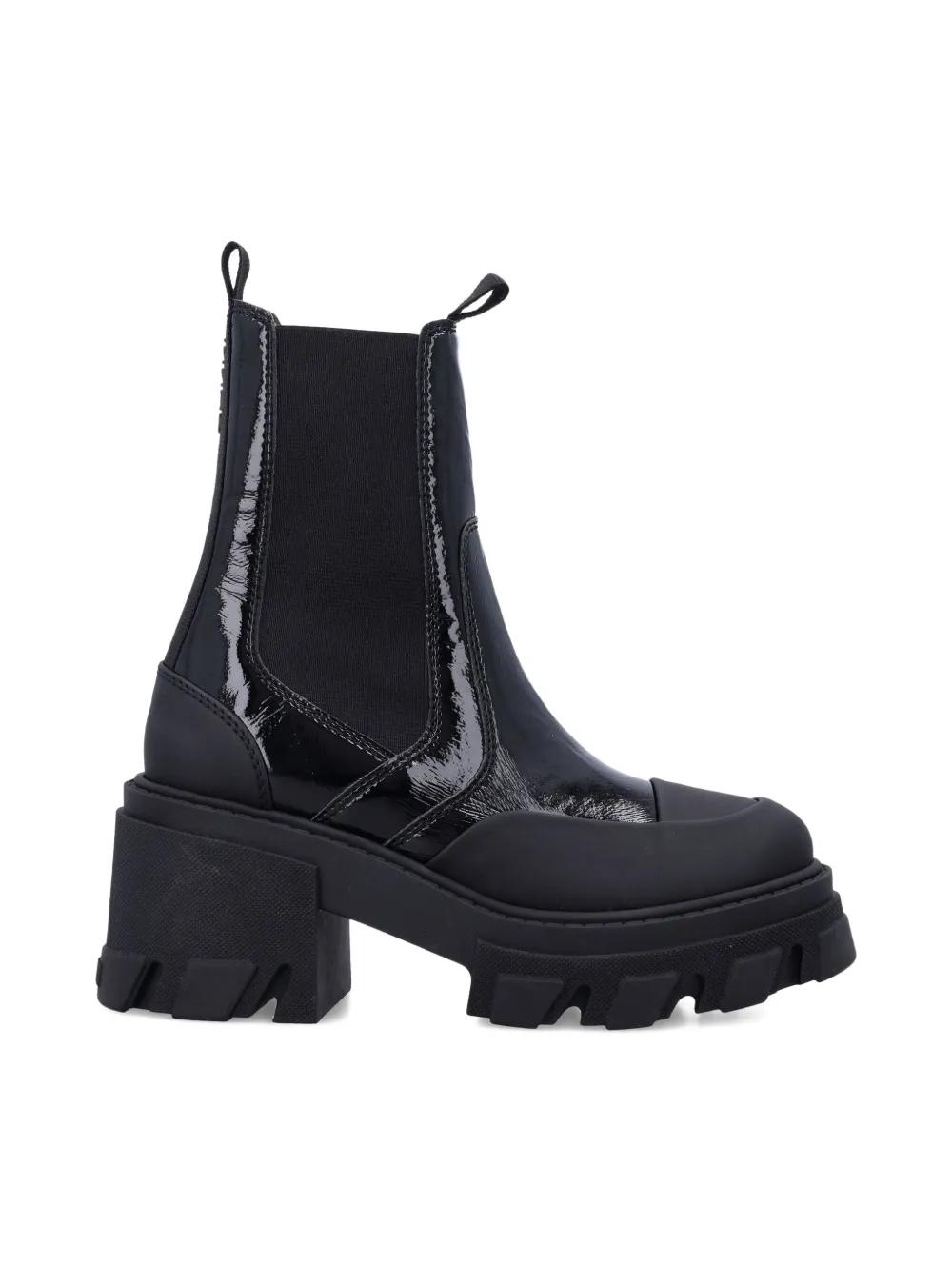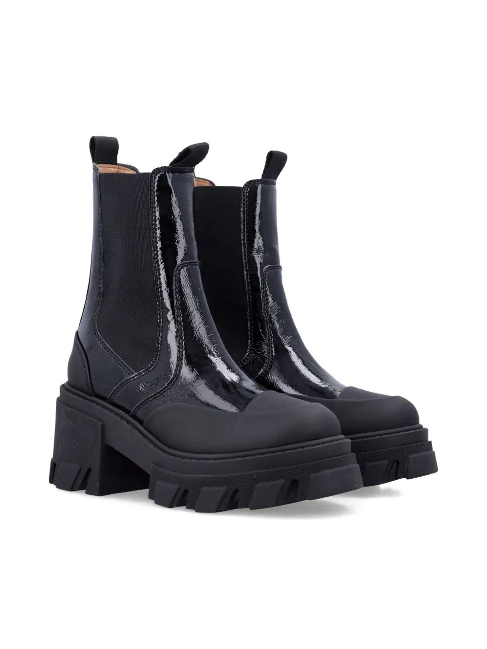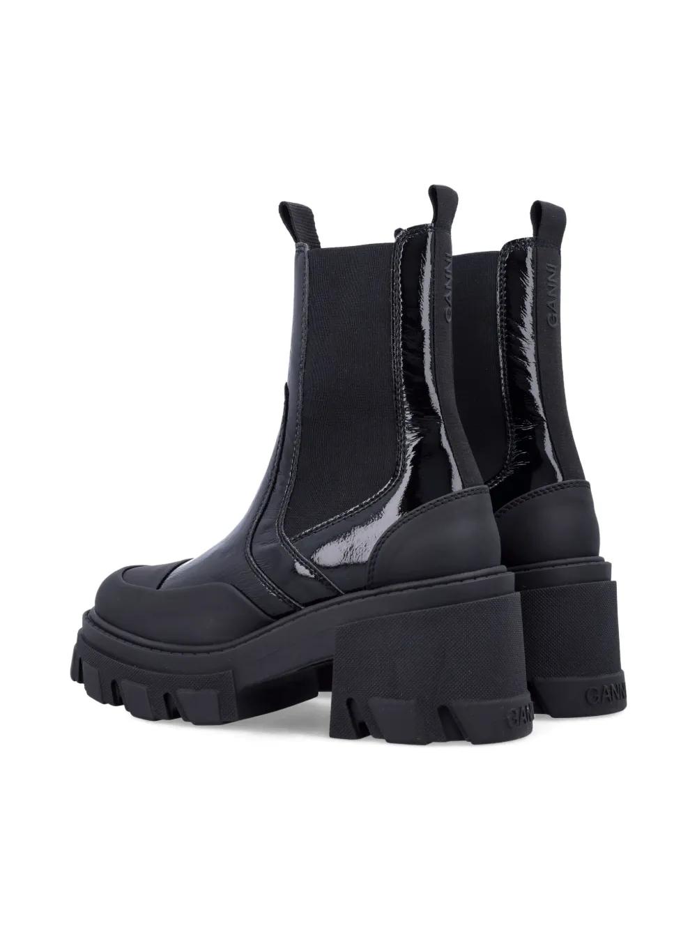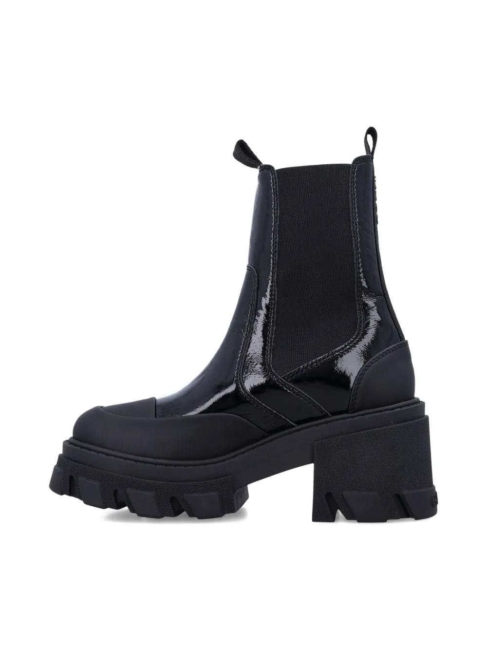 black patent leather cleated rubber sole block heel Chelsea-style elastic side panels round toe