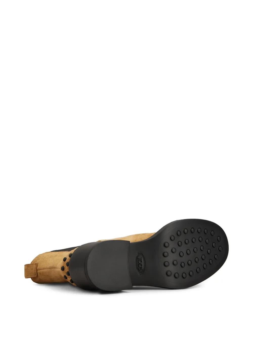 camel brown pull-on style elasticated side panels pull-tab at the heel mid block heel