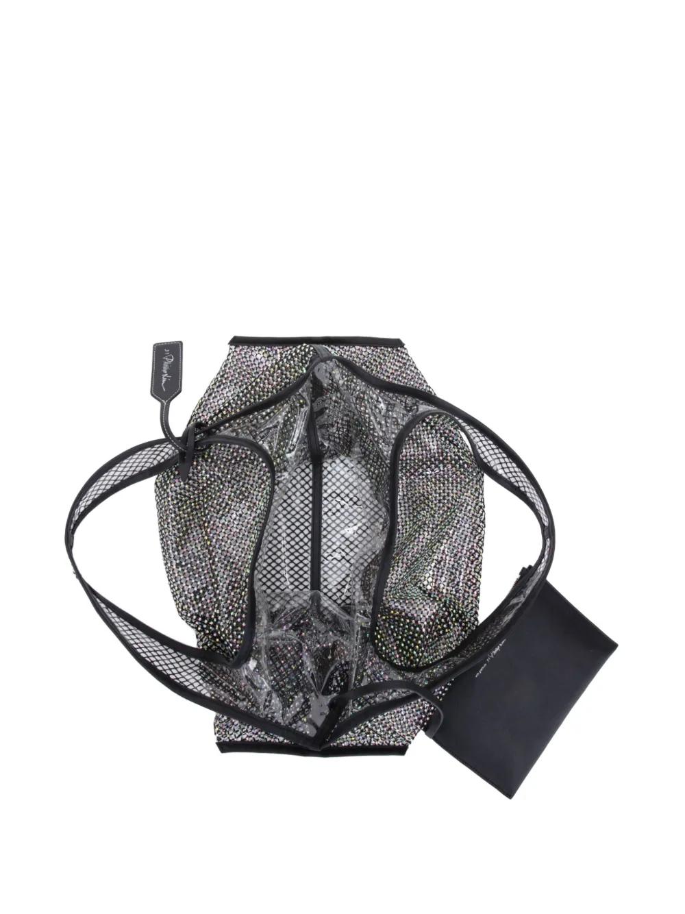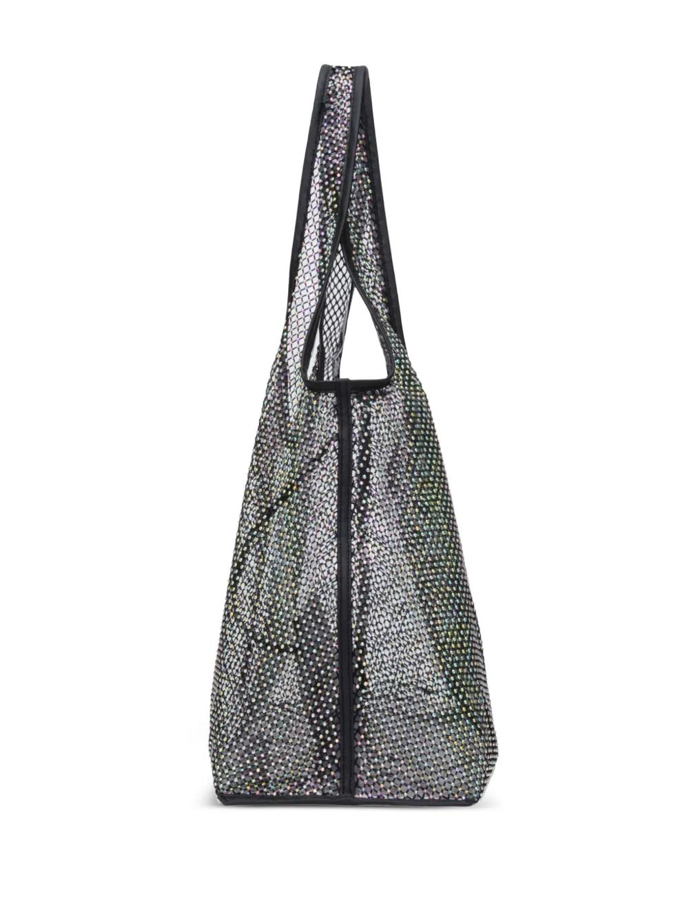 black leather mesh panelling crystal embellishment two top handles open top removable pouch