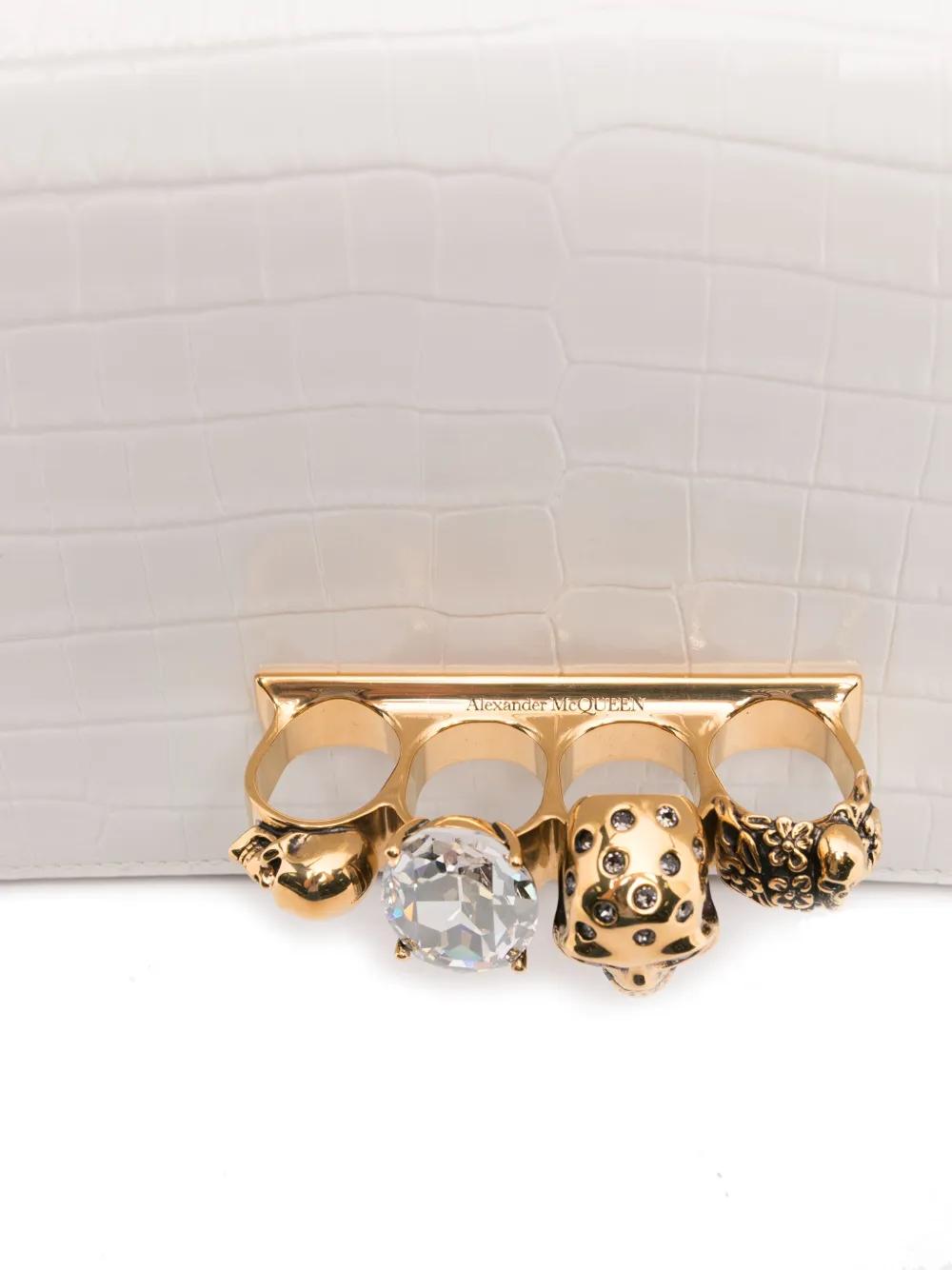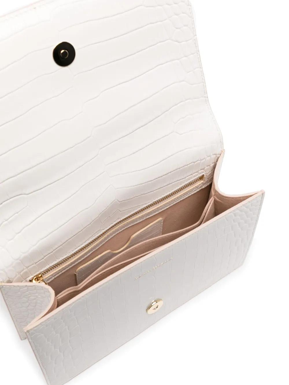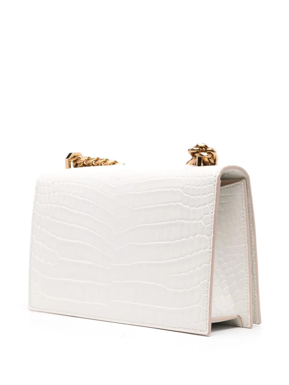 white calf leather embossed crocodile effect knuckleduster design sliding chain-link shoulder strap foldover top with magnetic fastening internal zip-fastening pocket internal card slot