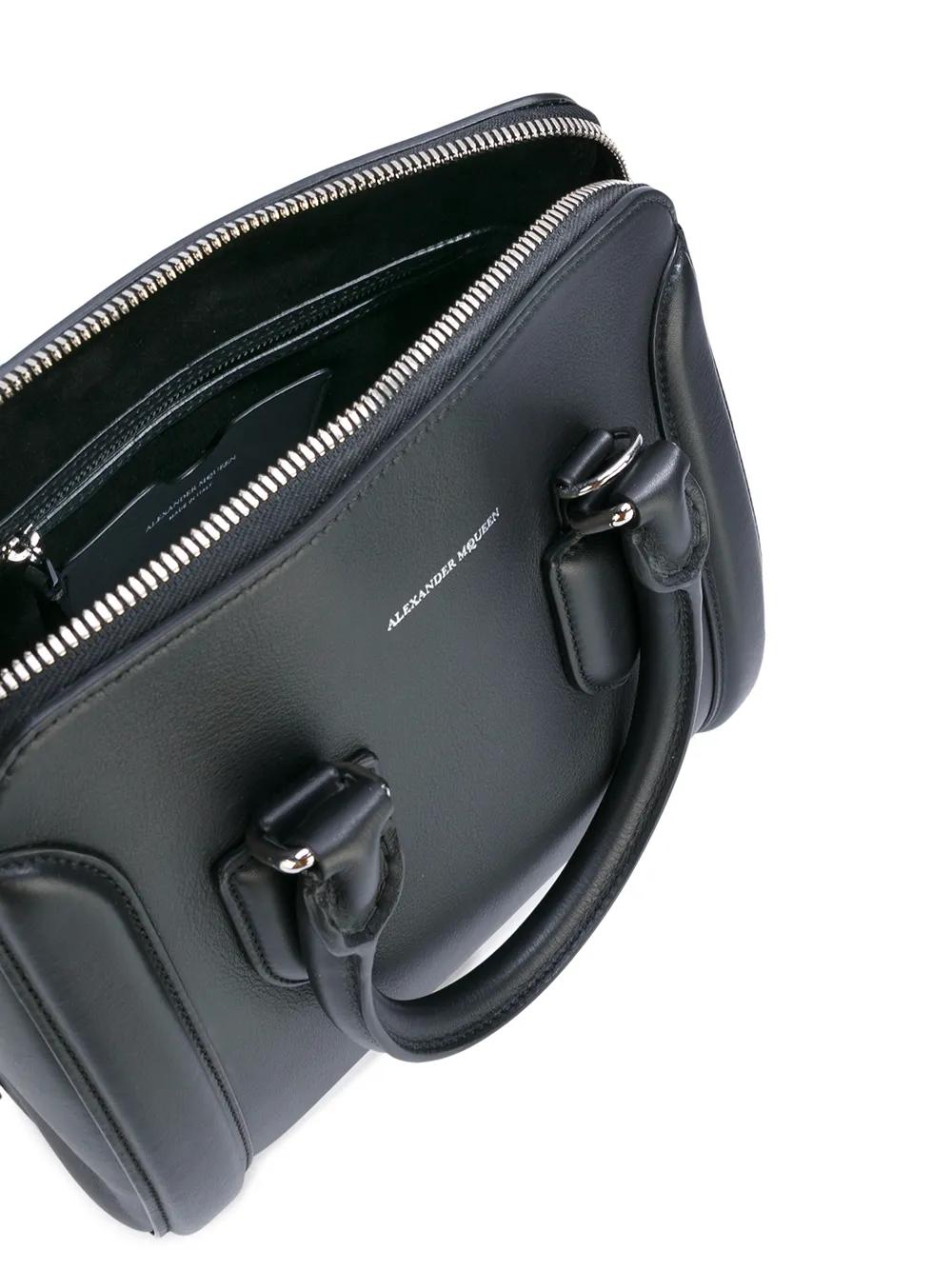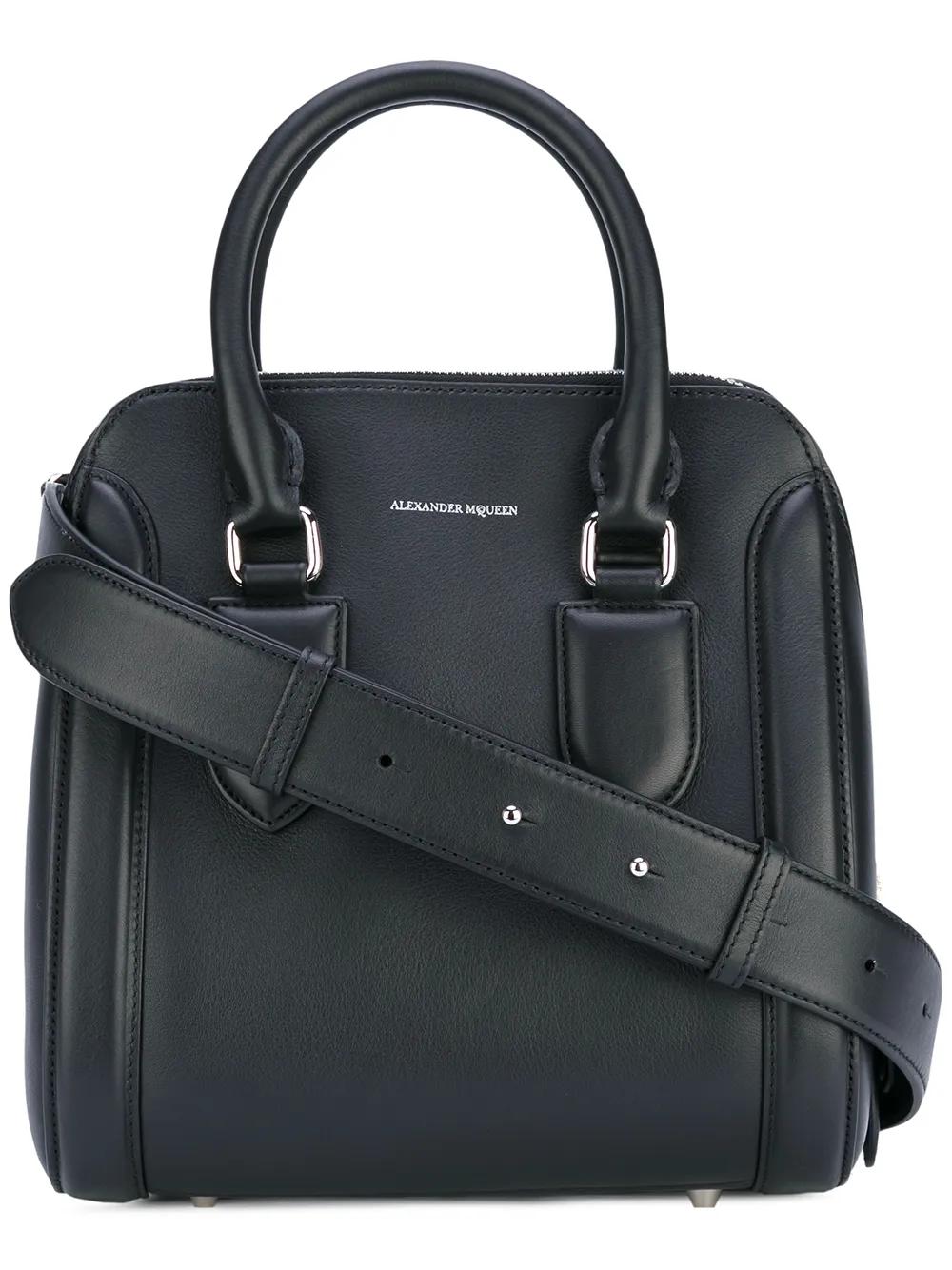 Sophisticated and effortless, this black leather Heroine tote from Alexander McQueen is the ultimate bag to carry this season. It features a front flap closure, round top handles, an interior zipped compartment and silver-tone hardware. Uniquely, it can be worn as an open tote or closed using the flap and the Italian made design is completed with a stylish detachable leather luggage tag with brass detailing.