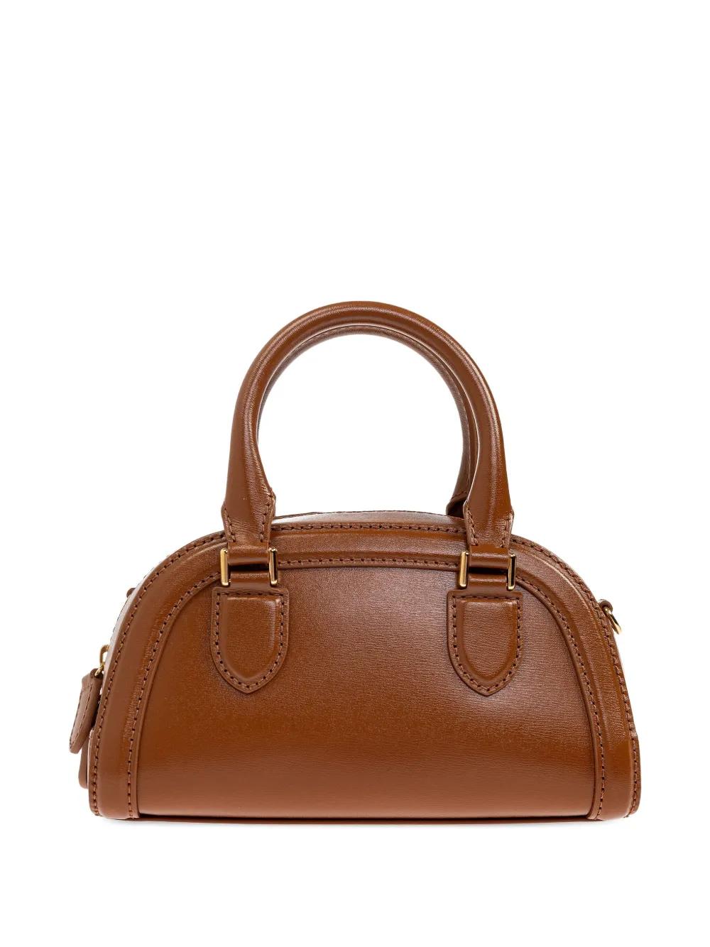 brown rounded top handles detachable shoulder strap zip top fastening logo lettering