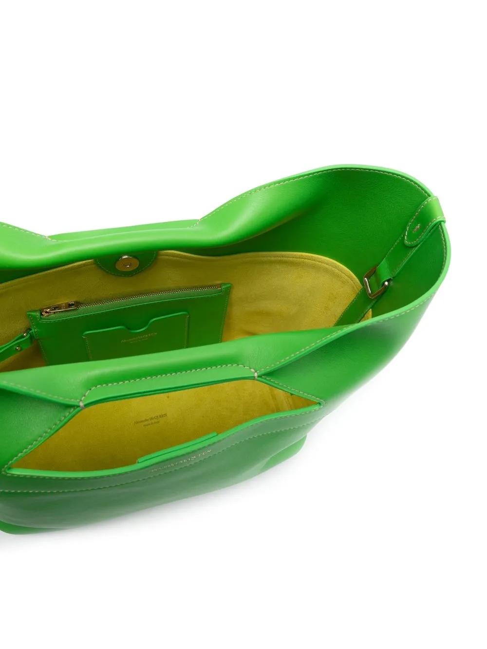 green calf leather tonal stitching logo stamp to the front magnetic fastening main compartment removable pouch single flat top handle adjustable detachable shoulder strap
