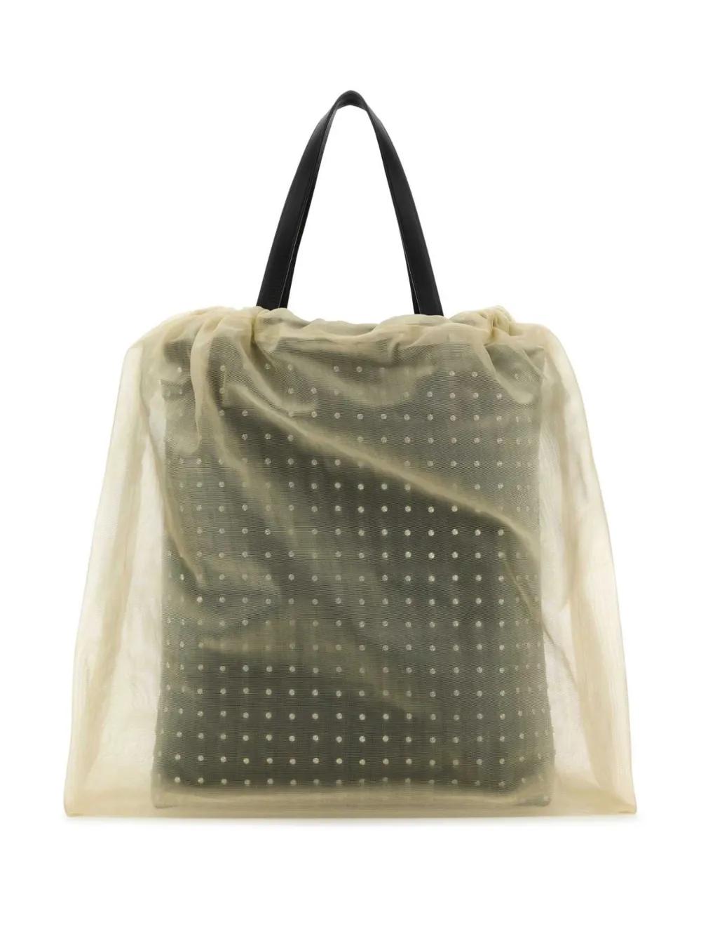 black leather drawstring fastening two top handles stud detailing tulle overlay logo plaque main compartment internal zip-fastening pocket internal card slot internal logo patch