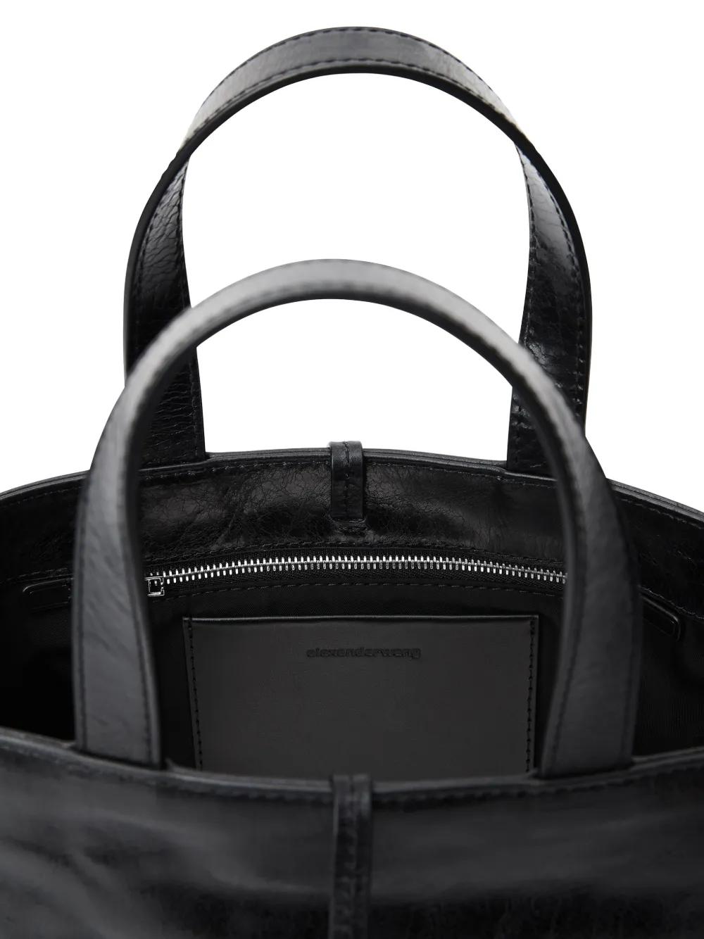 jet black calf leather smooth grain high-shine finish silver-tone hardware embossed logo to the front two long top handles adjustable detachable shoulder strap top tie fastening main compartment debossed internal logo internal zip-fastening pocket internal patch pocket
