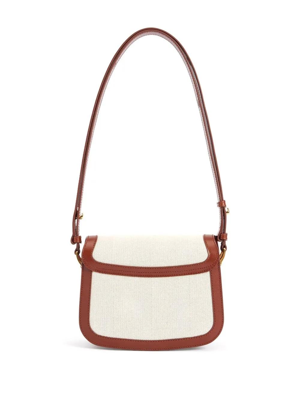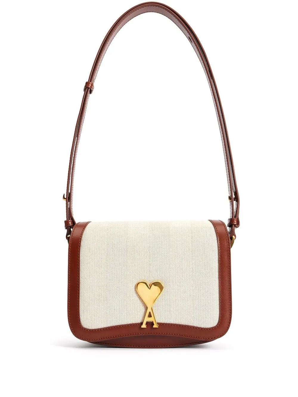 auburn brown leather/cotton panelled design signature Ami de Coeur monogram motif logo plaque gold-tone hardware foldover top with magnetic fastening adjustable shoulder strap main compartment internal logo stamp suede lining