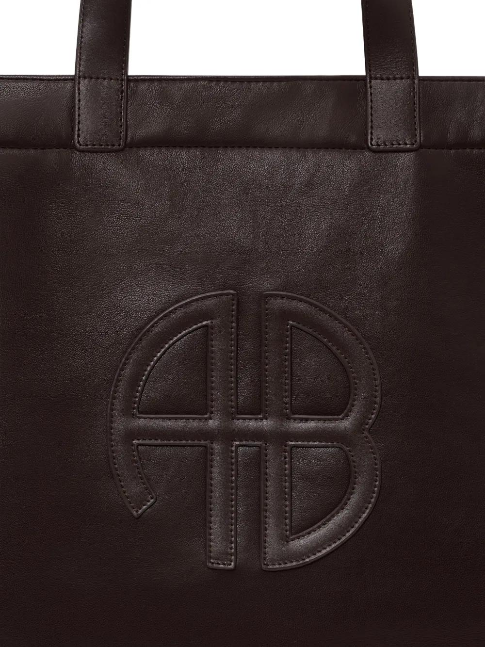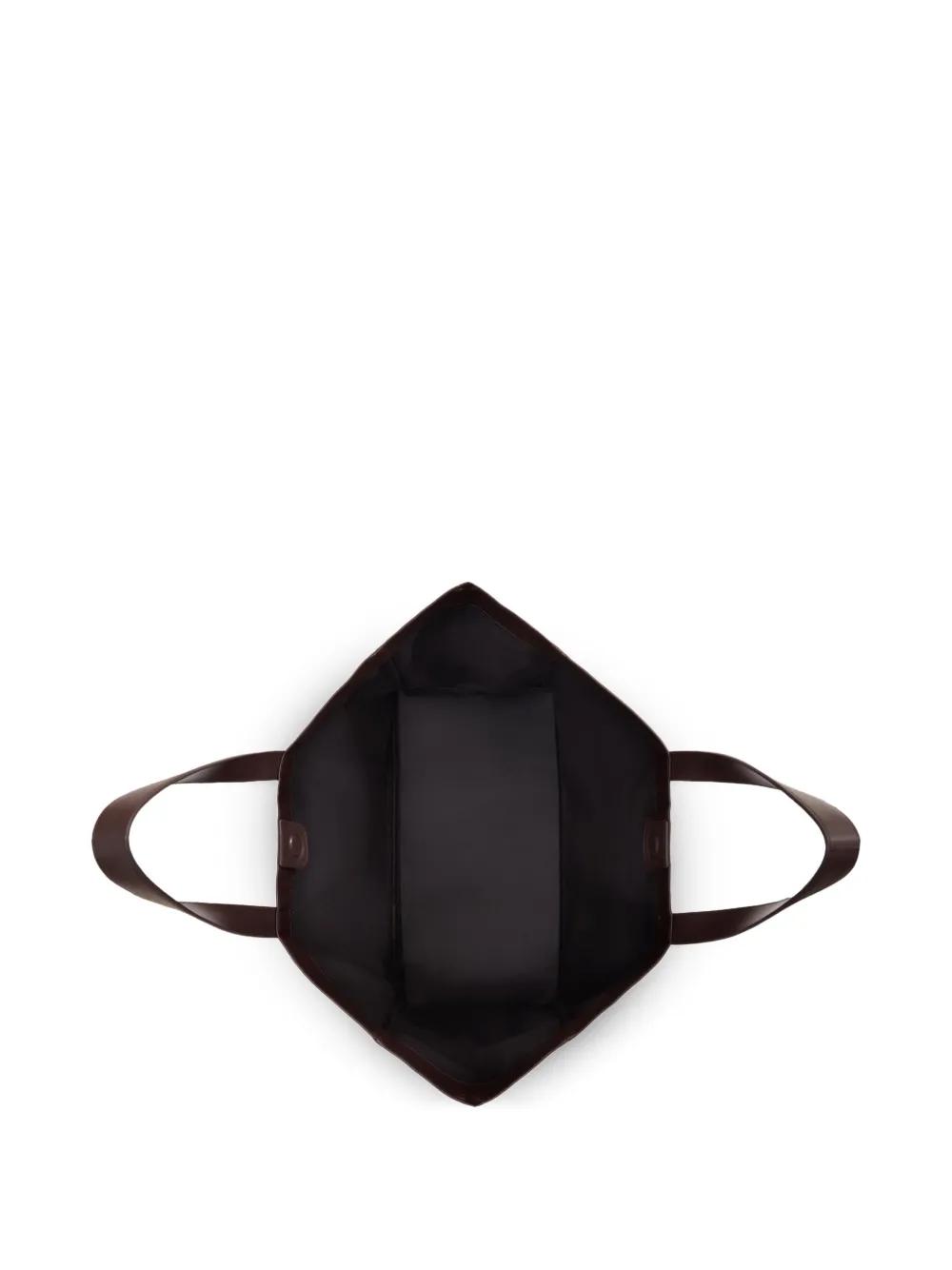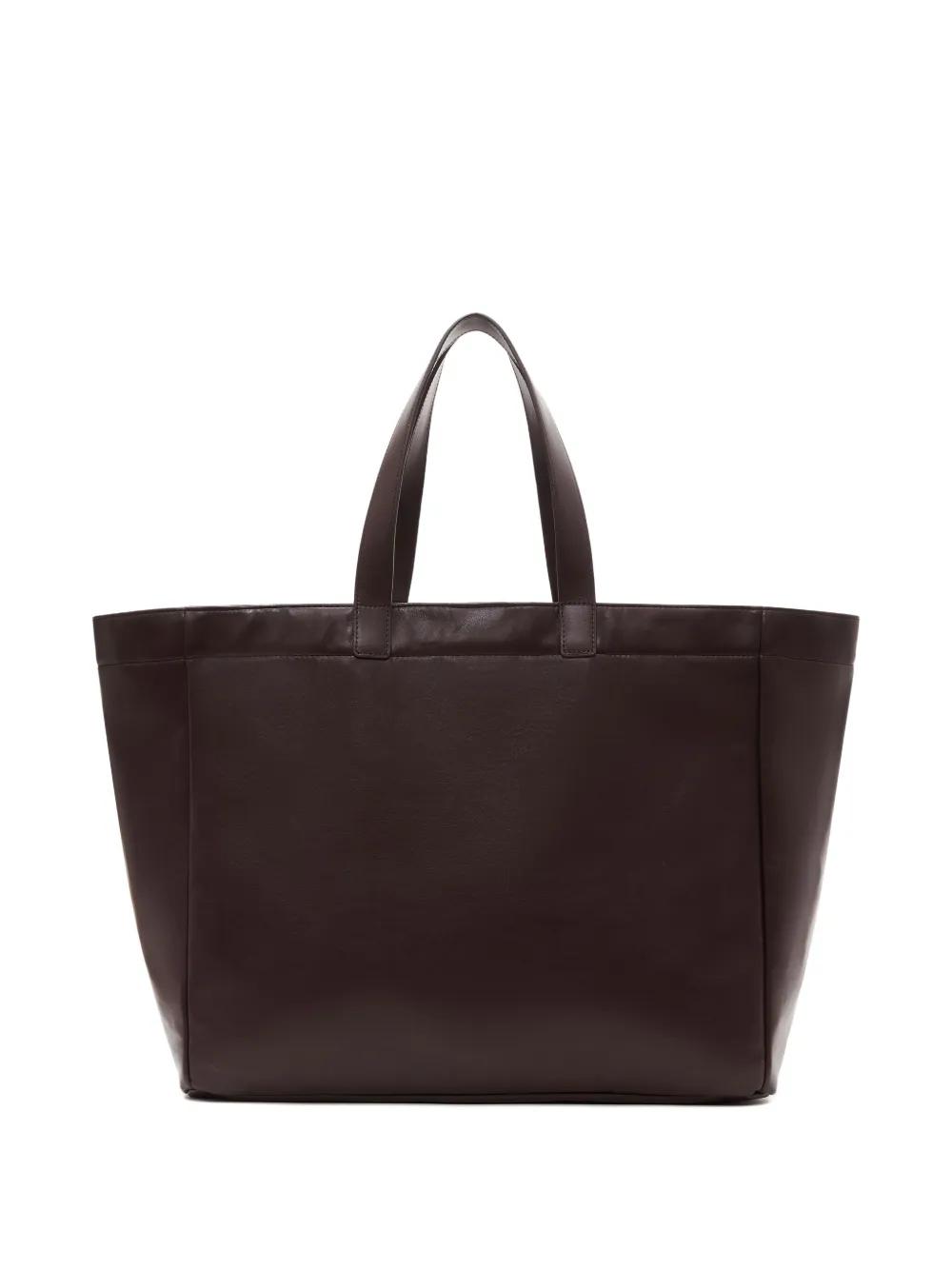 dark brown recycled leather construction top handles embossed logo open top internal pocket