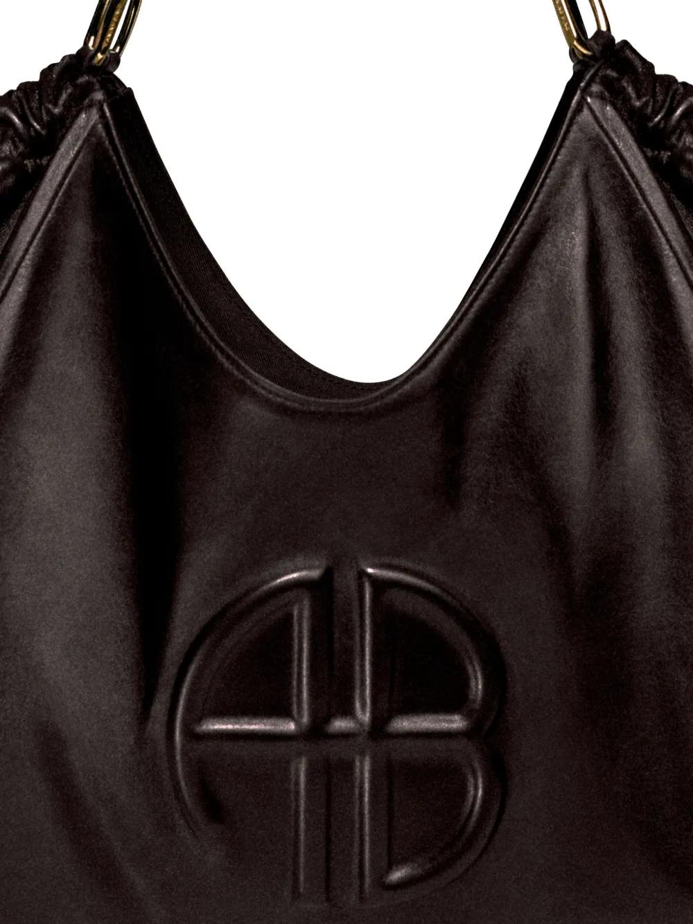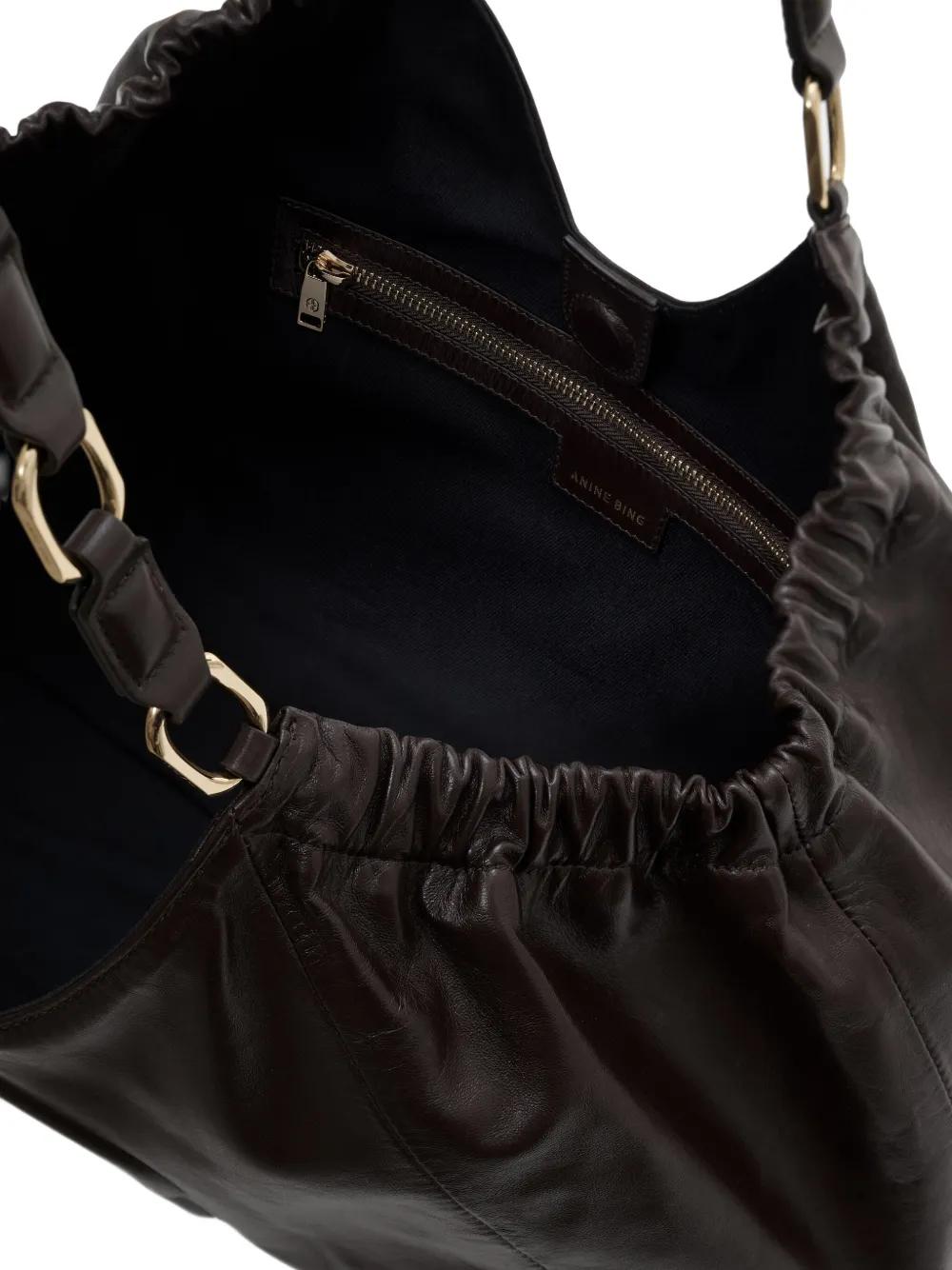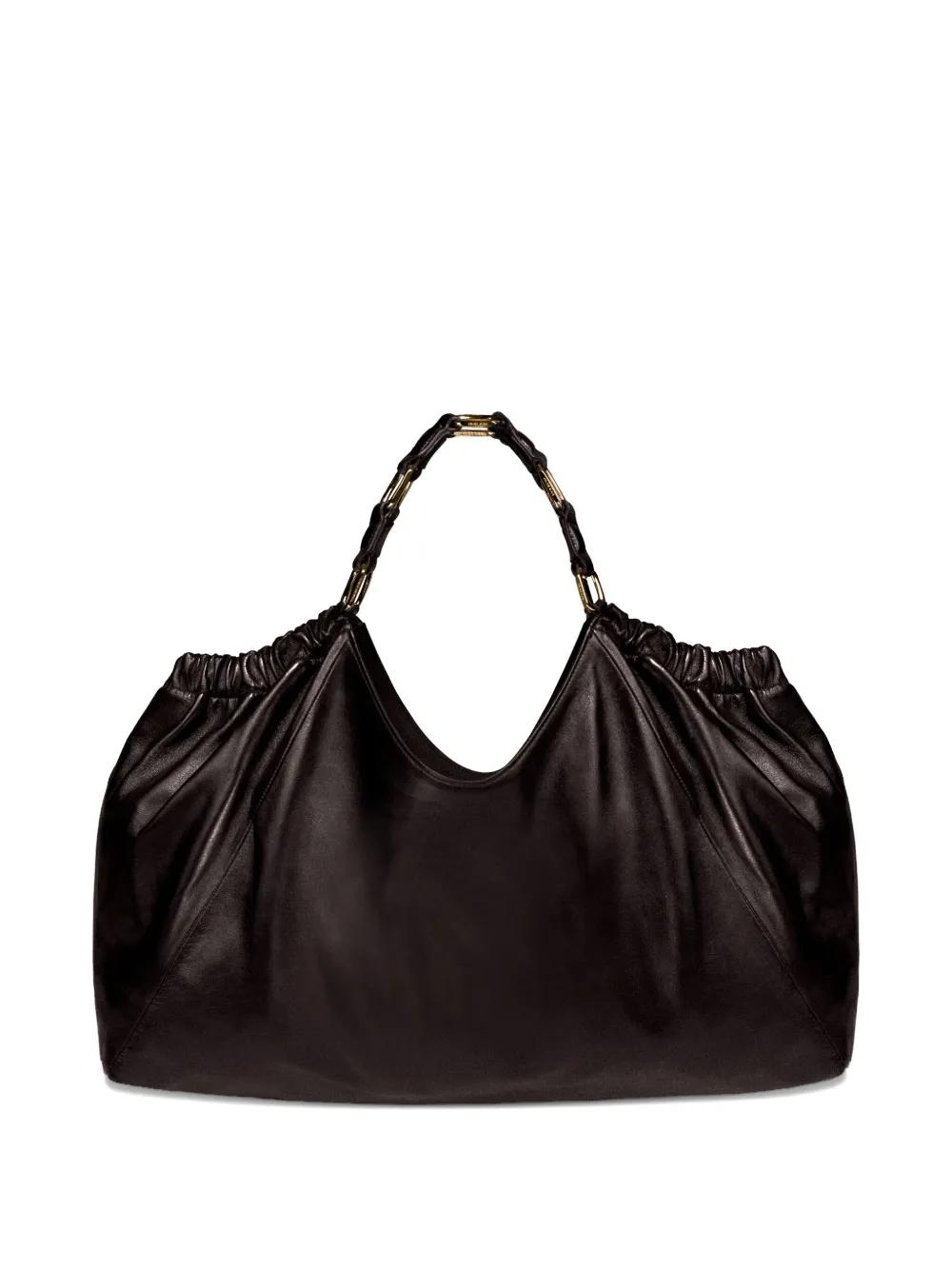 dark brown lambskin leather drawstring closure top handles embossed logo gathered detailing
