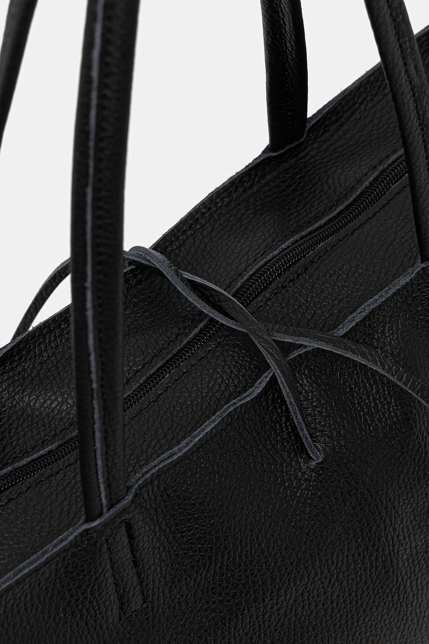 - Wiązana komora z zapięciem na suwak. - Model bez podszewki. - Usztywnione dno torebki pozwala zachować kształt produktu przez długi czas. - Kieszonka wewnętrzna zapinana na suwak. - Długie uchwyty dla komfortowego noszenia w dłoni lub na ramieniu. - Mieści format A4. - Dołączony tekstylny worek zabezpiecza produkt przed kurzem. - Długość uchwytów: 55 cm. - Głębokość: 12 cm. - Wysokość: 30 cm. - Szerokość u podstawy: 36 cm.