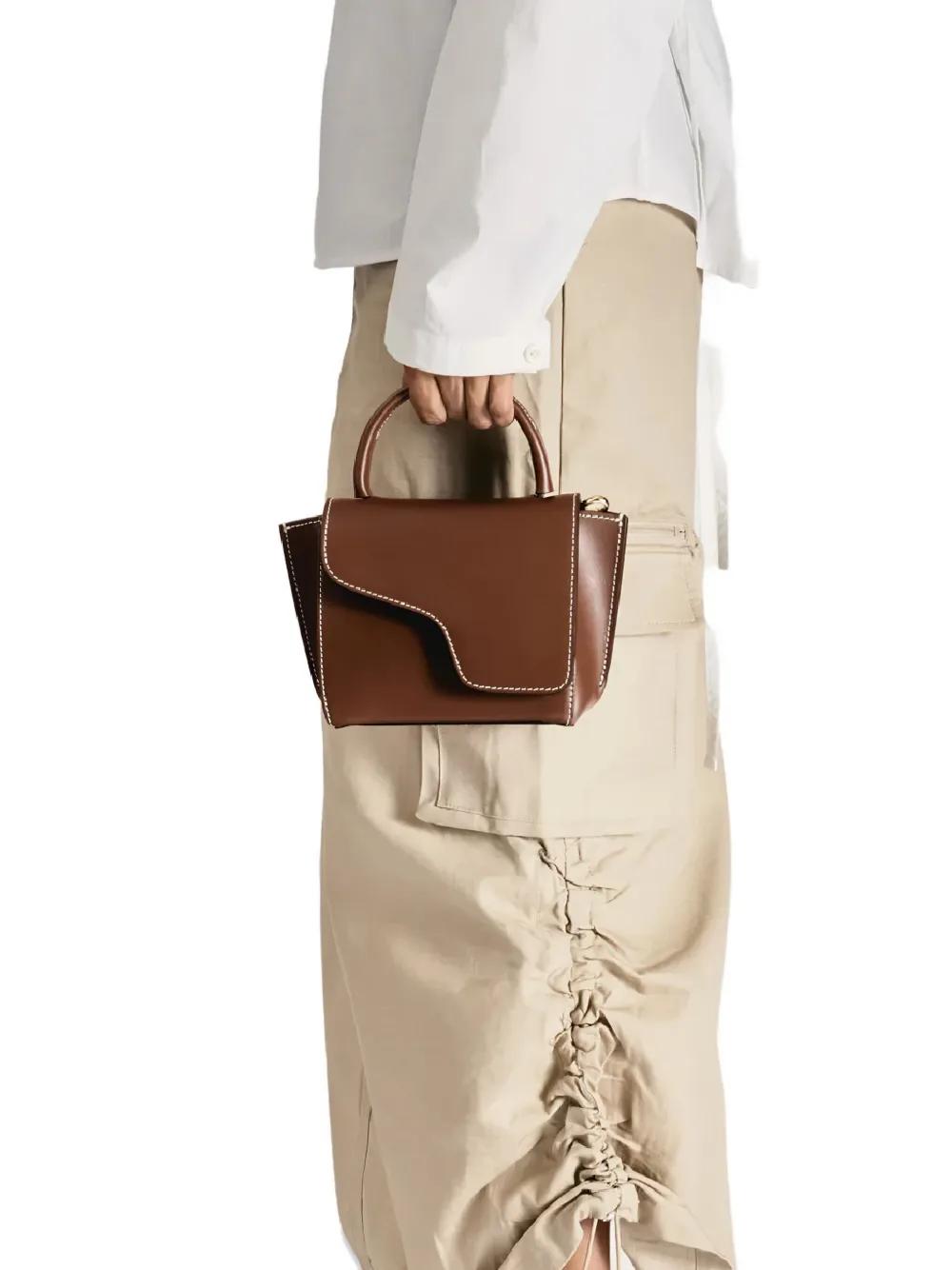 brown contrast stitching asymmetric flap magnetic closure top handle detachable shoulder strap