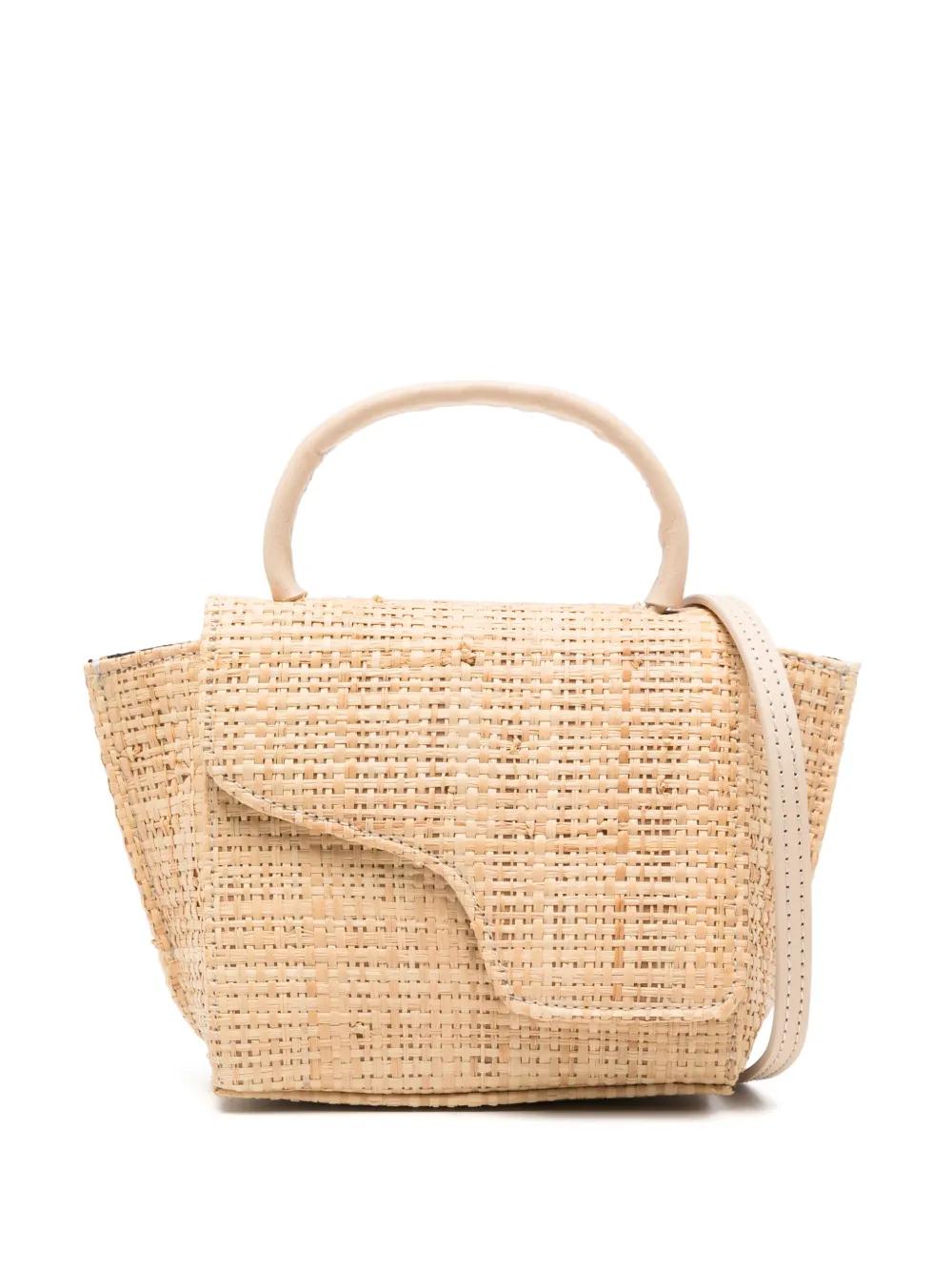 beige interwoven raffia design single top handle detachable shoulder strap front flap closure