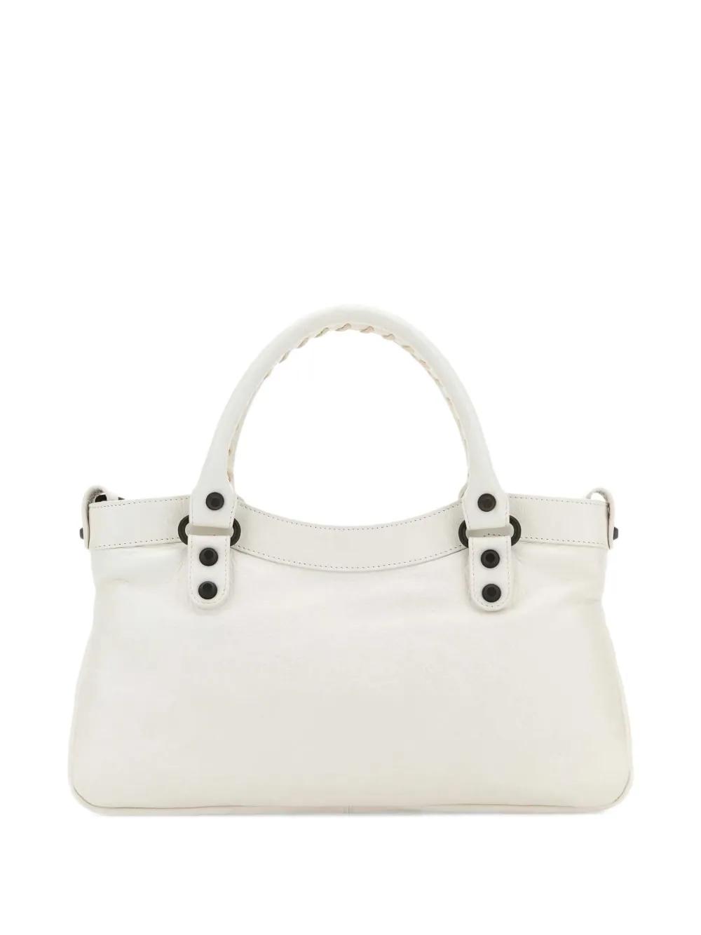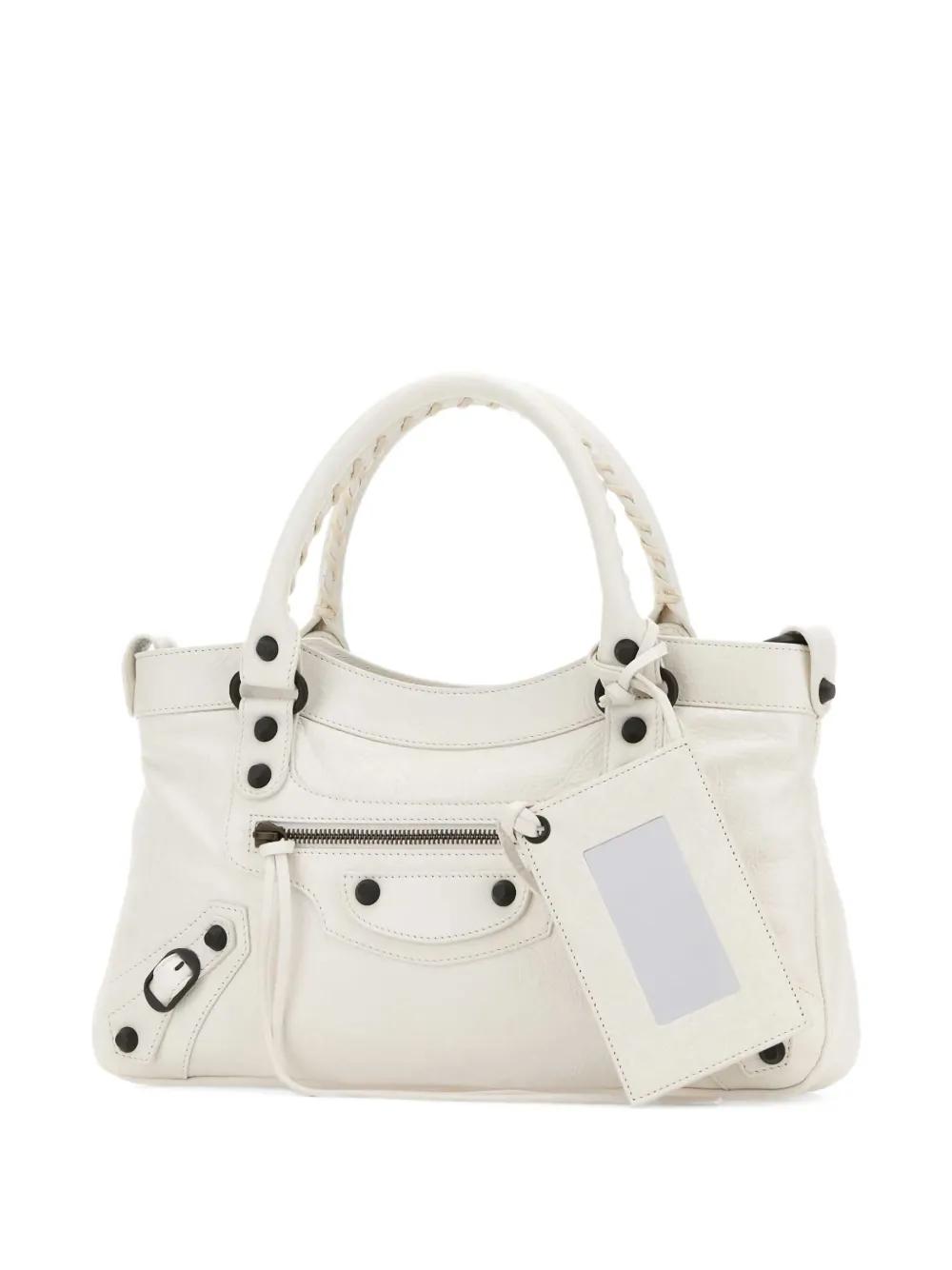 white lamb leather braided handle ruthenium finish studded details detachable mirror