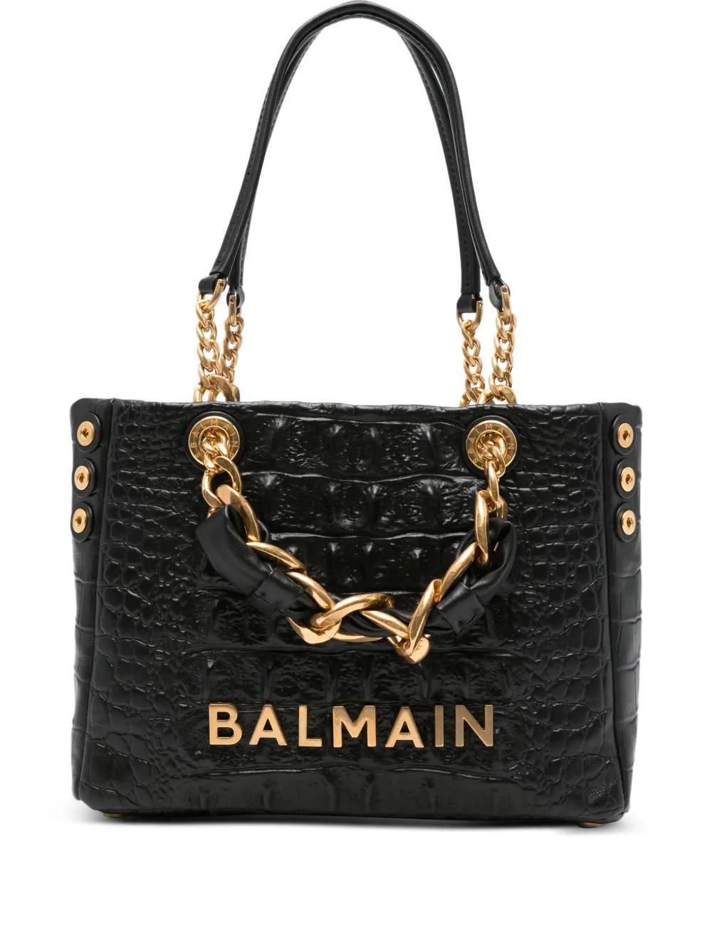 black crocodile-effect leather two top handles gold-tone chain detail gold-tone press studs magnetic fastening