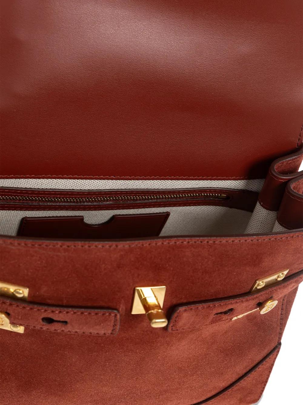 brown top handle gold-tone hardware logo plaque detachable shoulder strap internal slip pocket
