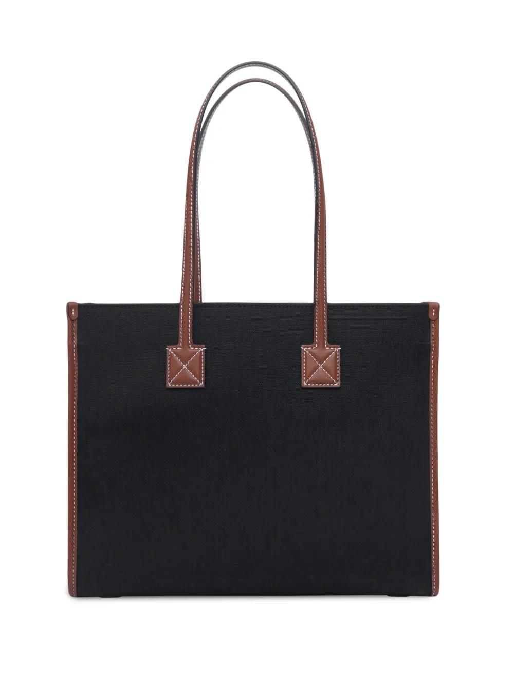 black/tan brown cotton leather trim front flap pocket embroidered logo to the front two long top handles concealed press-stud fastening main compartment internal zip pocket