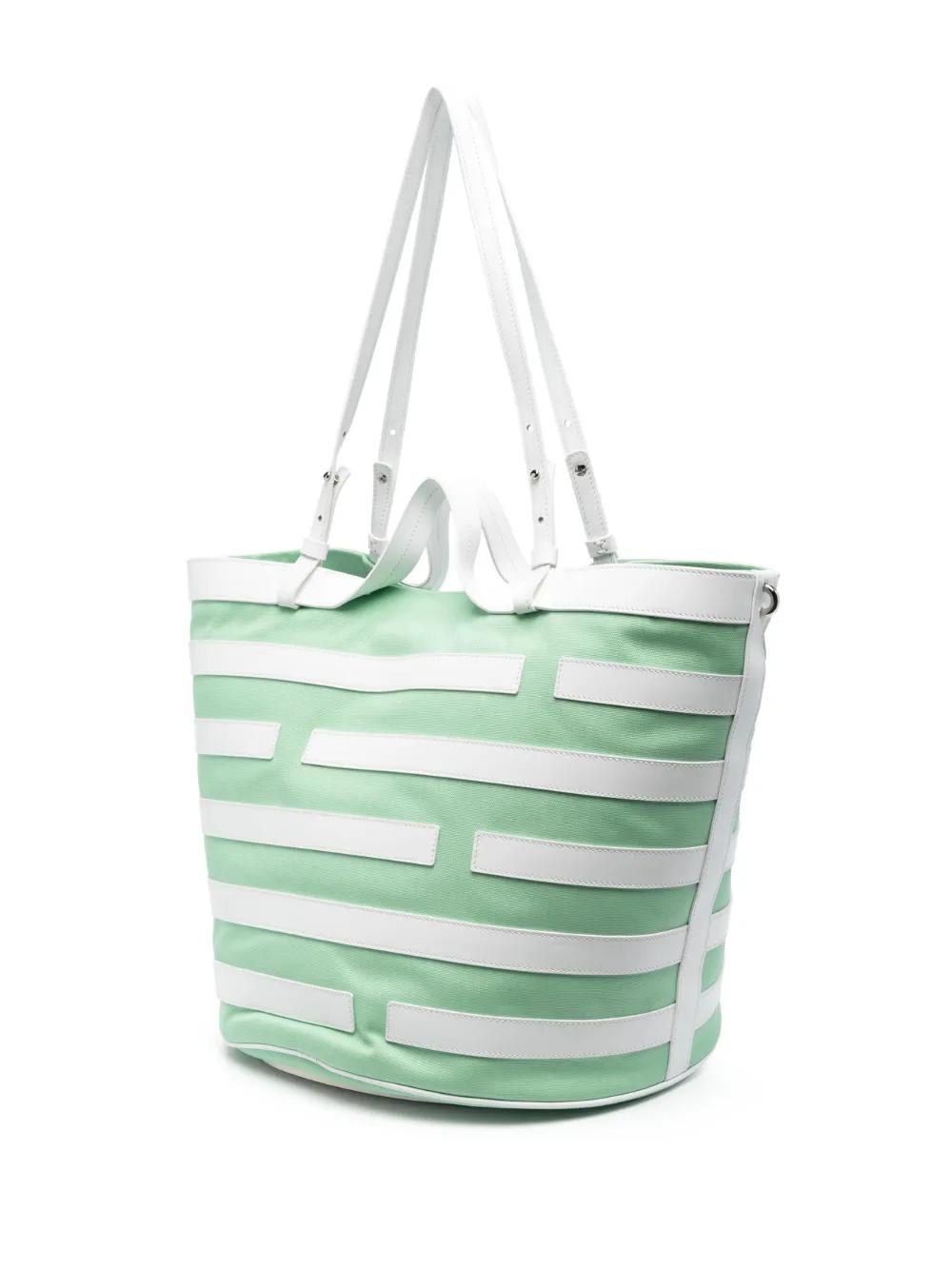 mint green/white calf leather vertical stripe pattern two long top handles two flat top handles adjustable shoulder strap logo embroidery embellishment internal zip-fastening pocket internal logo patch main compartment