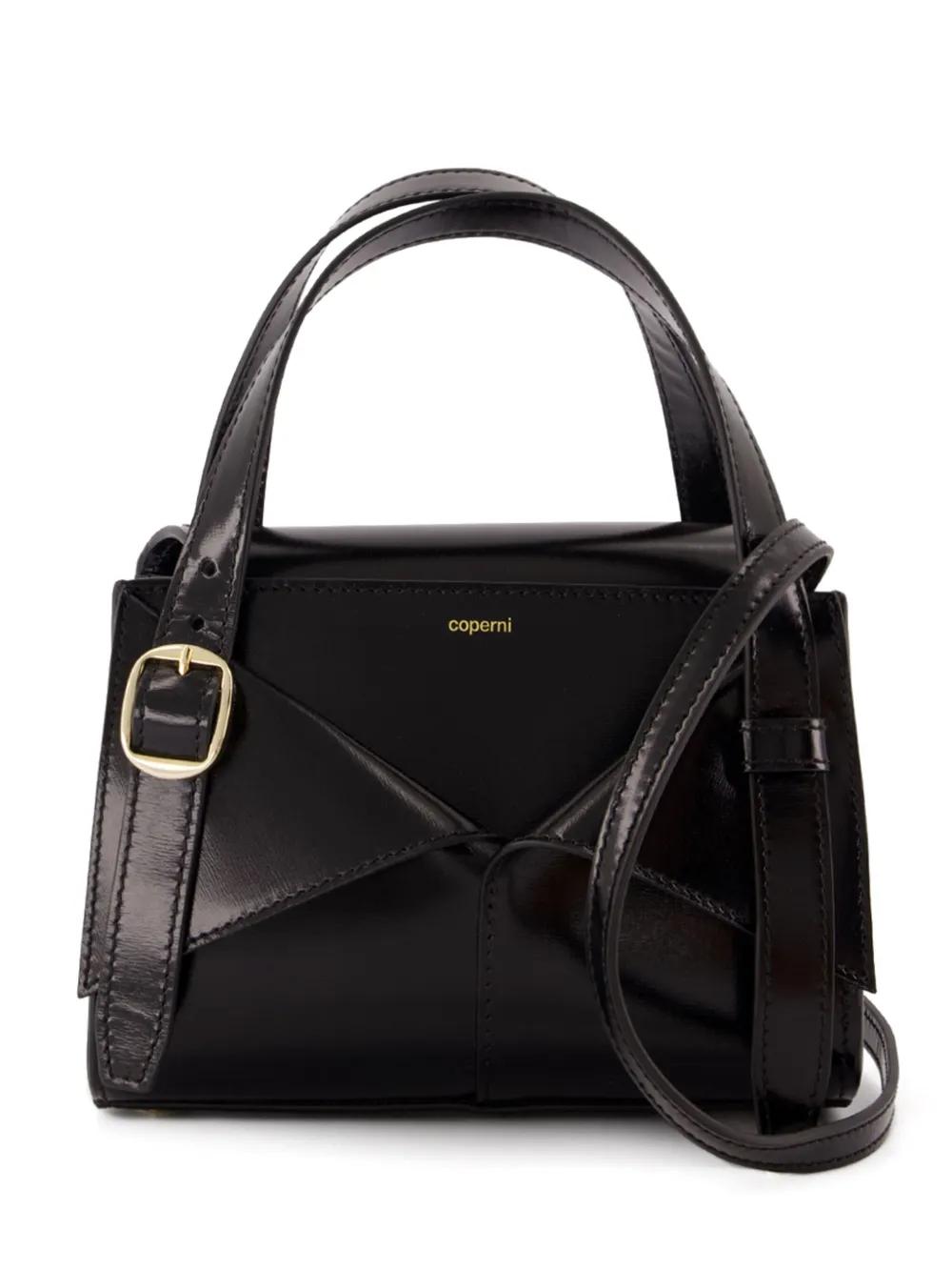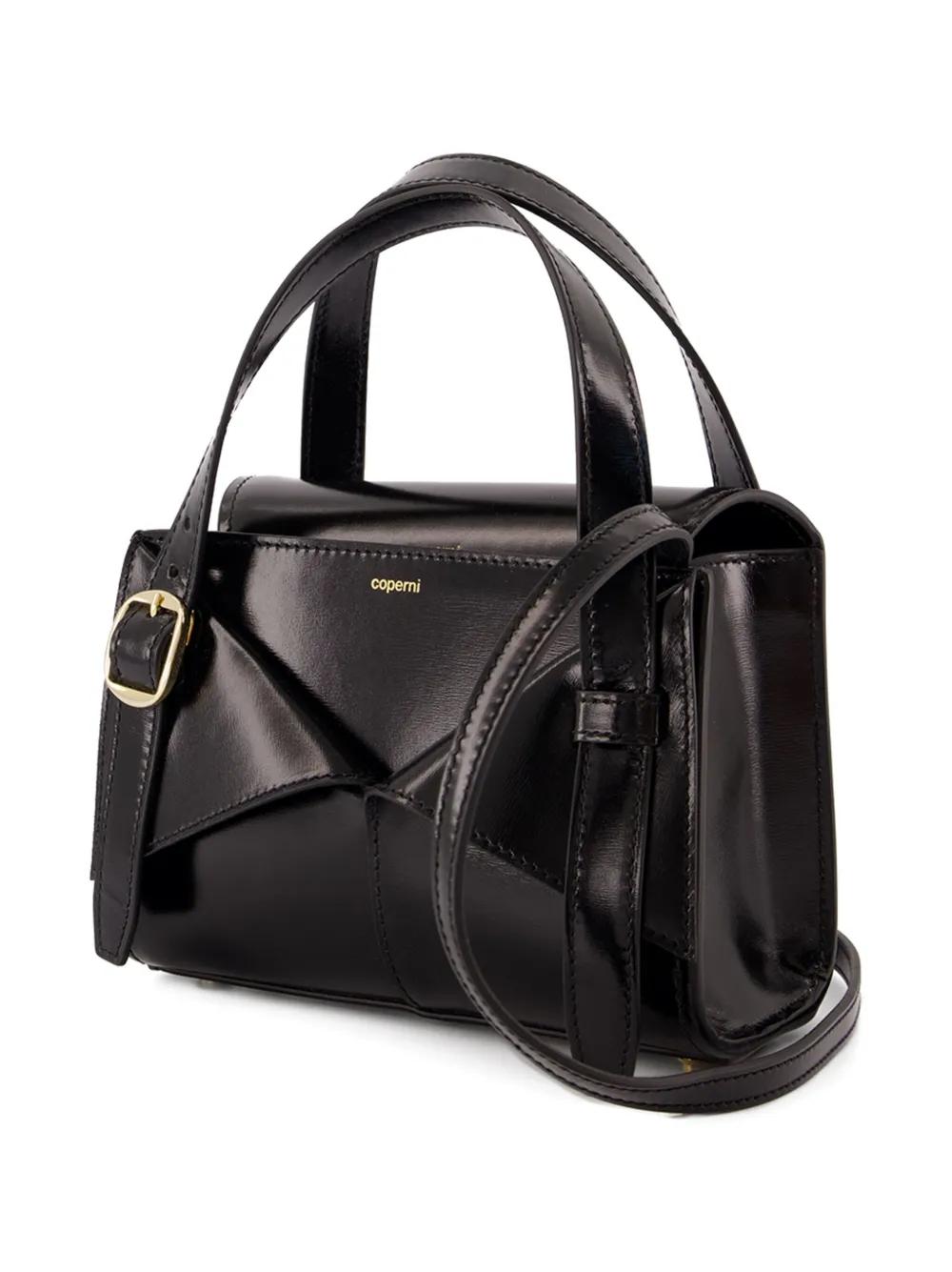 black calf leather patent finish foldover top two flat top handles adjustable detachable shoulder strap folded design gold-tone logo lettering decorative buckle detail